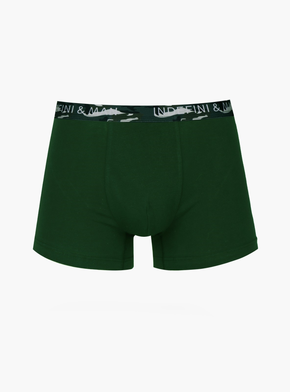 Классические мужские боксеры темно-зеленого цвета, выполненные из натурального хлопка. Модель оснащена удобной широкой резинкой с камуфляжным принтом, которая обеспечивает надежную фиксацию без дискомфорта.