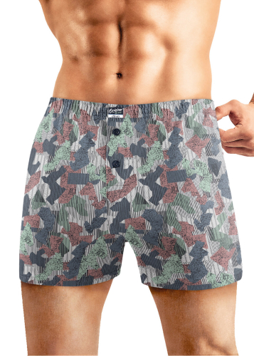 Шорты средней длины комфортной посадки выполнены из оригинального полотна в геометричную набивку. Трусы дополнены имиджевой жаккардовой резинкой.