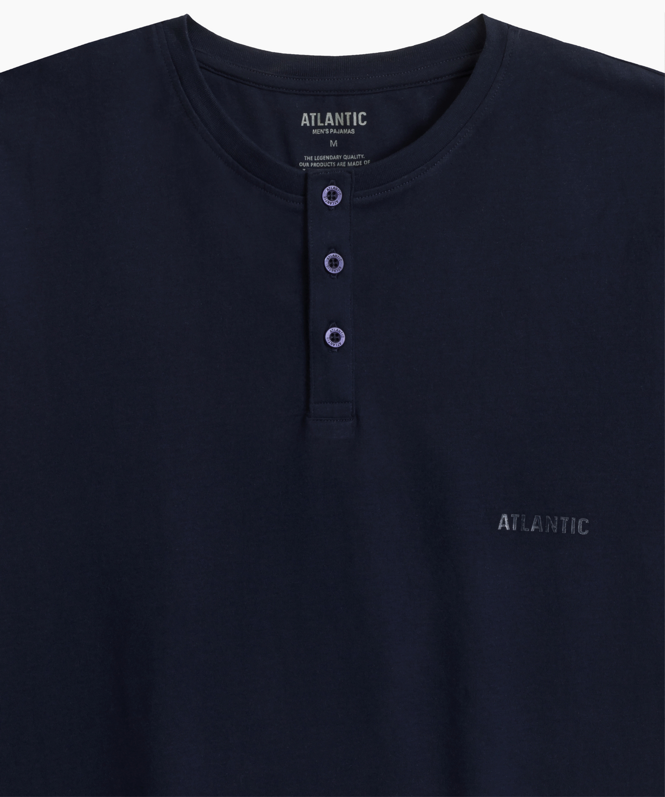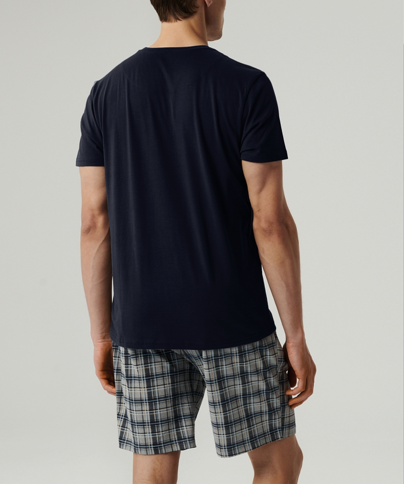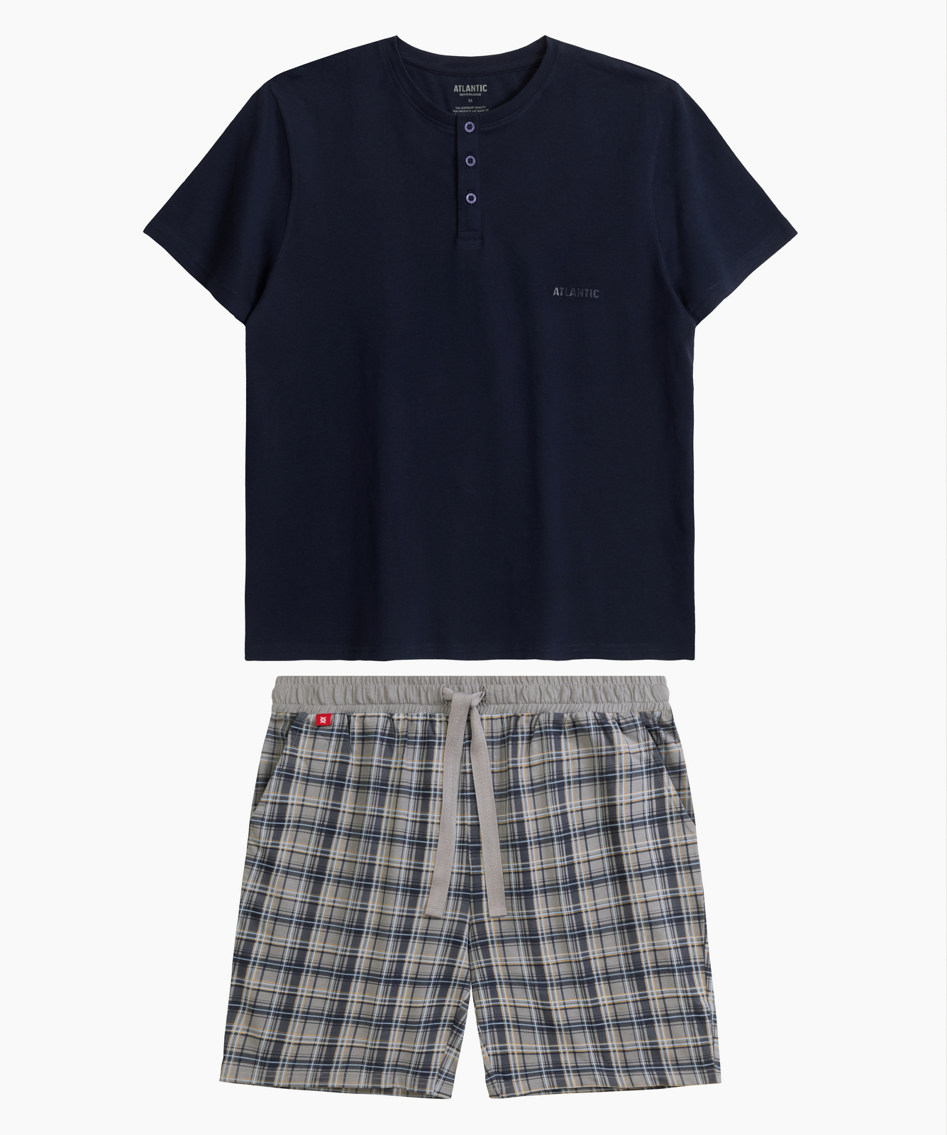 Мужская пижама Atlantic NMP-380 темно-синего и серого цветов из коллекции Homewear - стильный комплект из футболки и шорт для комфортного отдыха и повседневной носки. Комплект изготовлен из 100% хлопка с технологией "вычесывания" для повышенной прочности и эффектом "Peach Effect", создающим бархатистую поверхность для максимального комфорта. Шорты с классическим рисунком в клетку дополнены эластичным поясом на завязках и боковыми карманами, футболка с круглым вырезом легко сочетается с джинсами или спортивной одеждой. Доступны в различных расцветках: темно-синяя футболка с серыми шортами в клетку, денимовая с темно-синими. Натуральный хлопок обеспечивает воздухопроницаемость, отличное влагопоглощение и сохранение формы после стирок. Размерная сетка от S до 4XL, стильная упаковка делает комплект идеальным подарком для мужчин любого возраста.