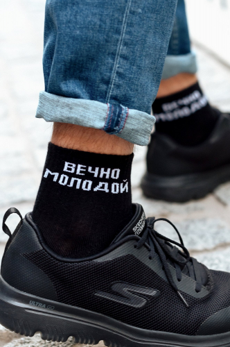 Белые мужские носки с прикольной надписью Вечно молодой точно поднимут настроение и разбавят повседневные будни! Демисезонная модель средней длины выполнена из смесового трикотажа: хлопок с добавлением эластана для лучшей посадки по ноге.