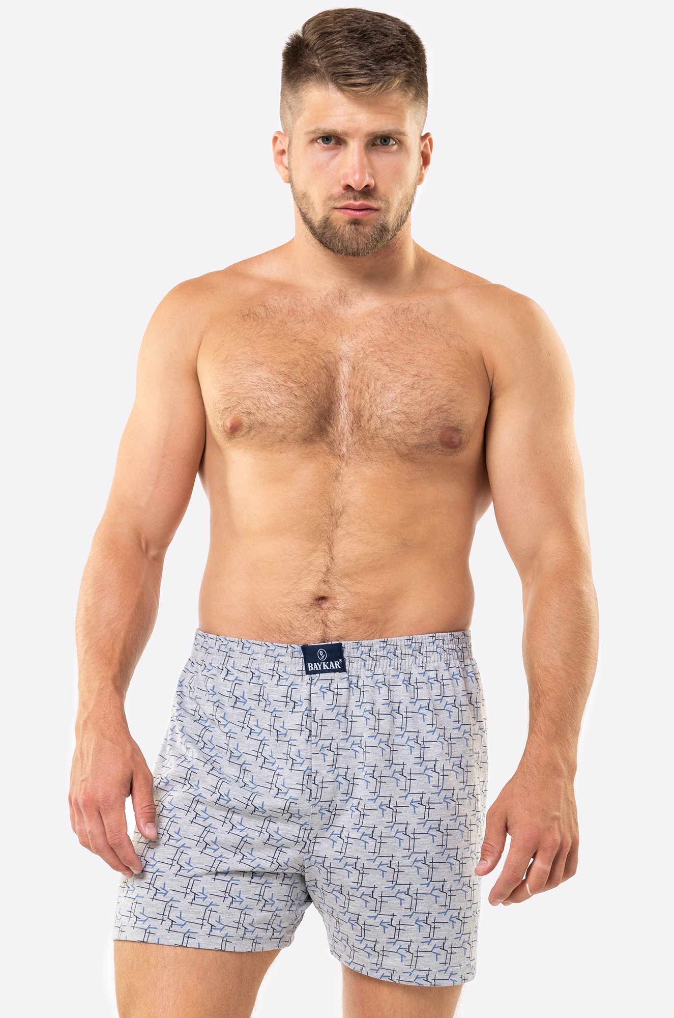 Мужские семейные трусы выполнены из качественной, 100% хлопковой трикотажной ткани. Трусы семейники представлены в светло-серой цветовой гамме и украшены мелким рисунком, на поясе брендовая нашивка.