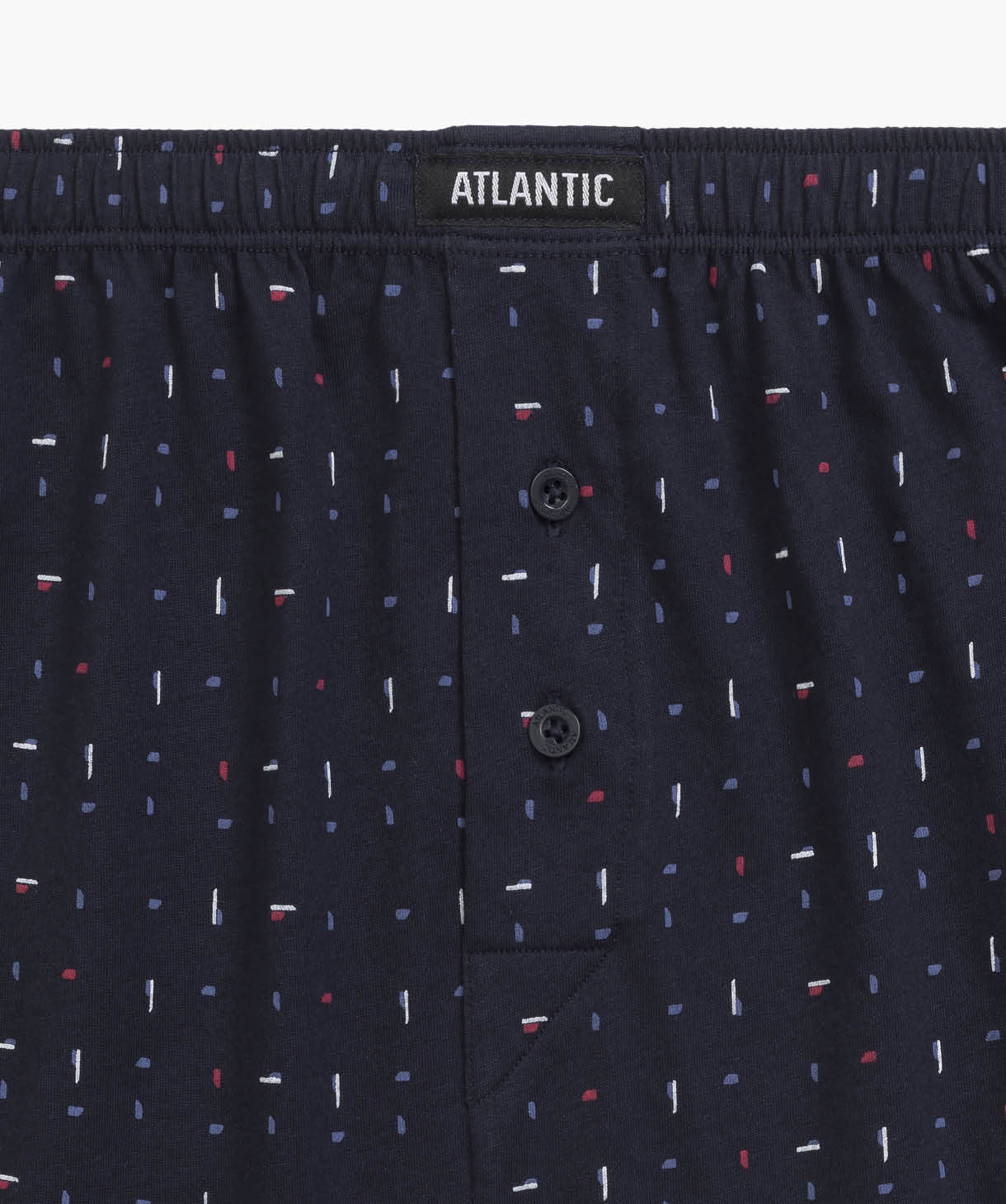 Набор из 2 шт. мужских трусов-боксеров Atlantic темно-синего цвета. Мужские трусы-боксеры 2MBX-056 от польского бренда Atlantic на каждый день: превосходно подойдут абсолютно любому мужчине как для повседневной носки, так и для занятий спортом. Классический свободный крой этой модели гарантирует идеальную посадку по фигуре, свободу движений и максимальный комфорт. Скрытая туннельная резинка не давит и не натирает при носке, а также обеспечивает контакт только с натуральным материалом. Свободные мужские боксеры имеют стандартную линию талии и штанины, доходящие до середины бедра, поэтому могут подойти к классическим брюкам или джинсам. В составе мужских семейных трусов используется мягкий, приятный на ощупь 100% хлопок. Трикотажное хлопковое полотно является прочным материалом, устойчивым к высоким температурам и растяжению, благодаря чему нижнее белье надолго сохраняет свой внешний вид и потребительские свойства. В упаковке представлено двое мужских боксерок в темно-синей расцветке с классическим графическими принтом. Нижнее белье Атлантик будет превосходным подарком для мужчин всех возрастов: молодым парням и подросткам подойдут модели нижнего белья в яркой цветовой гамме и с паттерном или рисунком, более взрослым мужчинам - нижнее белье в сдержанных или строгих цветах, хотя иногда можно нарушить правила и поэкспериментировать. Кроме того, в нашем интернет-магазине Вы сможете приобрести трусы боксеры Атлантик 2MBX-056 из наличия по самым выгодным ценам. Широкая размерная сетка с самыми популярными (от S до XXL) и большими (3XL, 4XL) размерами, а также стильная фирменная упаковка нашего нижнего белья помогут однозначно сделать Вам верный выбор!
