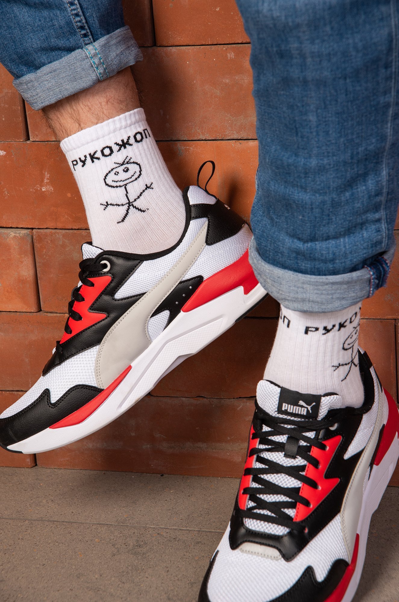 Стильные мужские носки с прикольной надписью – идеальный способ добавить в образ крутую изюминку! Белые носки для мужчин выполнены из нежного хлопка. Забавный рисунок поднимет настроение и разбавит серые будни.