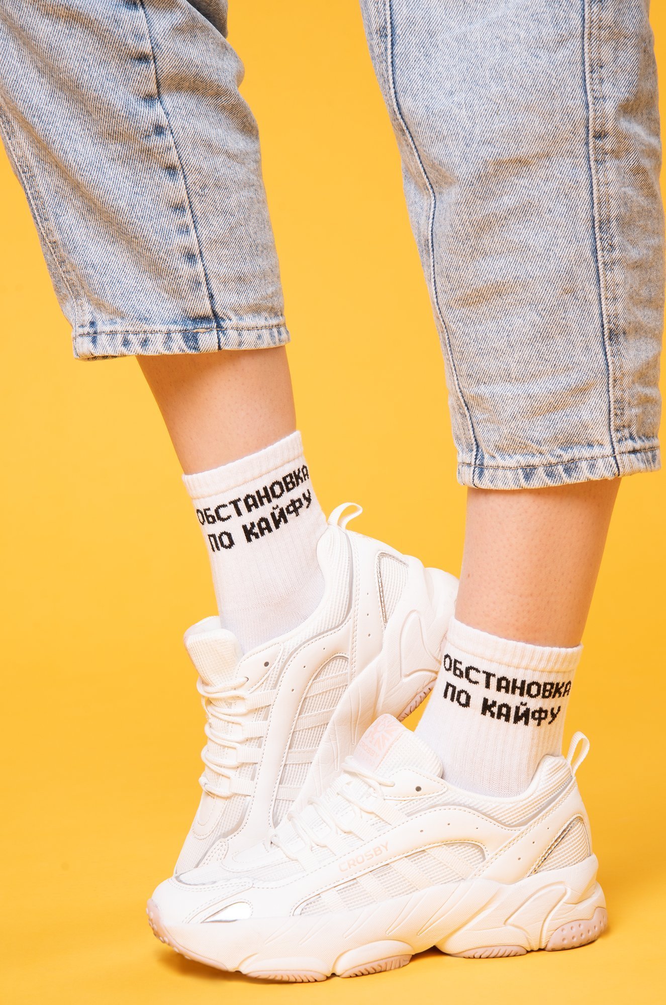 Белые женские носки выполнены из натурального хлопка и украшены прикольной надписью Обстановка по кайфу.