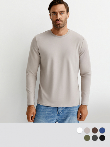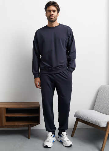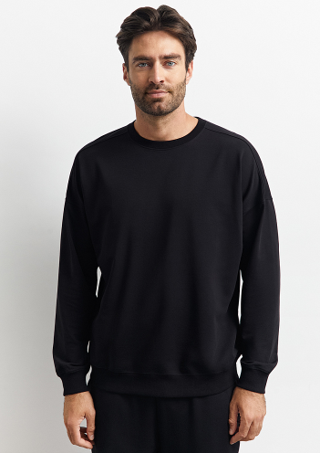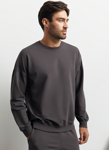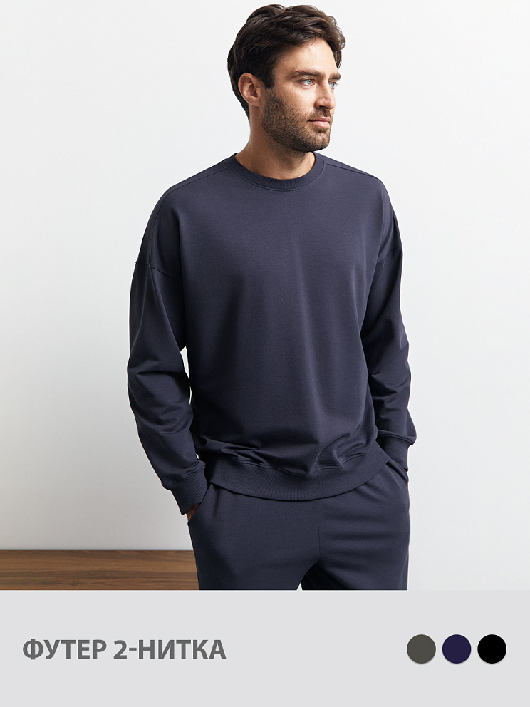 Мужской свитшот свободного кроя из двухниточного футера со спущенным плечом, длинными рукавами и круглым вырезом. Манжеты, горловина и низ, оформленные рибаной в лаконичный рубчик, добавляют текстурности и делают силуэт более графичным. Трикотажный материал на основе мягкого хлопка отлично пропускает воздух, приятно ощущается на теле и подходит даже для чувствительной кожи. Добавление эластана способствует сохранению формы изделия. 95% хлопок/ 5% эластан