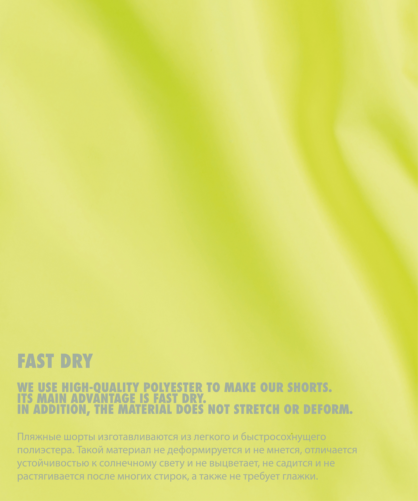 Полиэстер – это высокопрочное, приятное на ощупь, легкое синтетическое волокно, которое не деформируется и не мнется. Изделия из полиэстера после стирок не садятся и не растягиваются, а также быстро сохнут и практически не требуют глажки после стирки. Эта ткань отличается устойчивостью к солнечному свету и не выцветает.