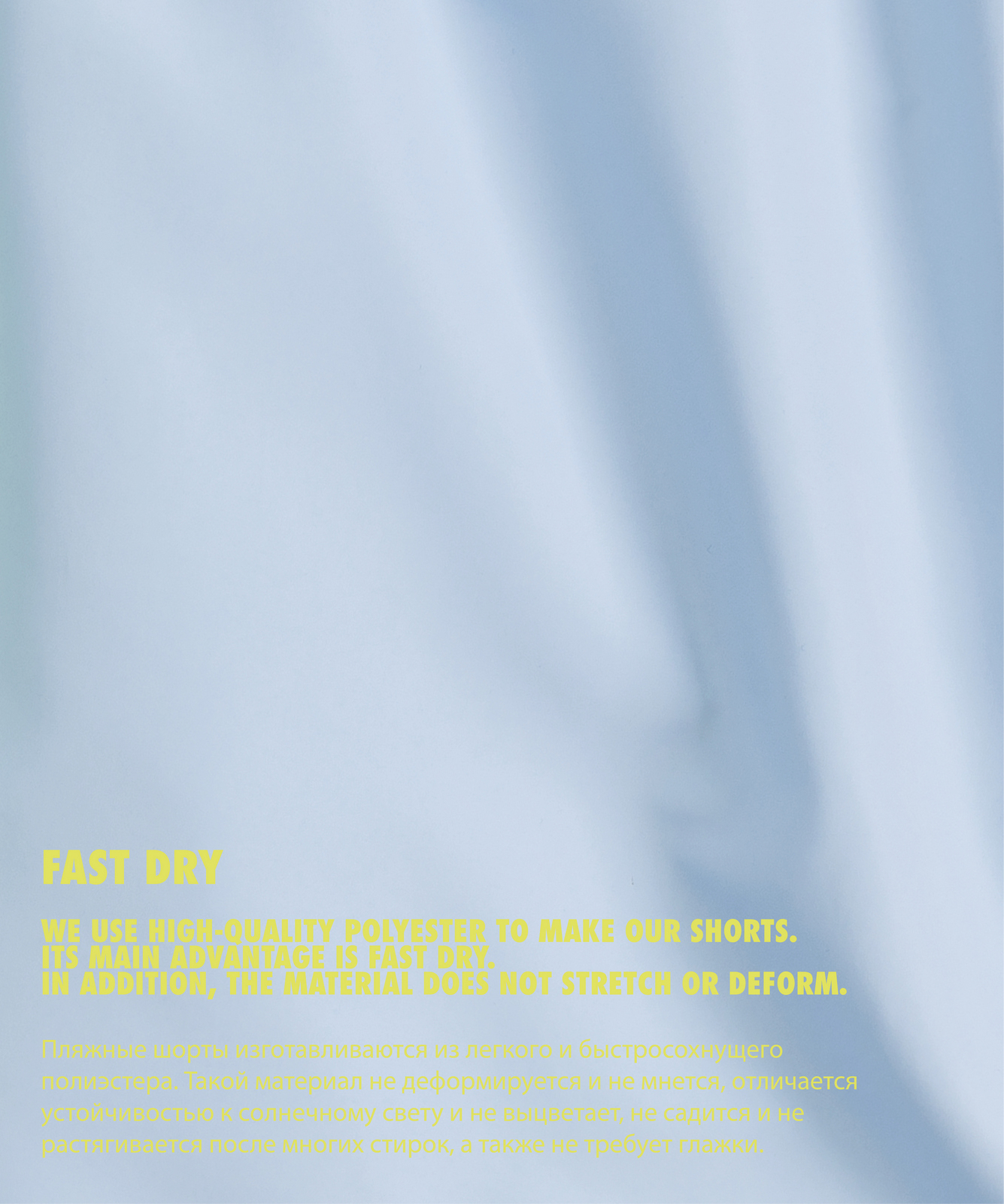Полиэстер – это высокопрочное, приятное на ощупь, легкое синтетическое волокно, которое не деформируется и не мнется. Изделия из полиэстера после стирок не садятся и не растягиваются, а также быстро сохнут и практически не требуют глажки после стирки. Эта ткань отличается устойчивостью к солнечному свету и не выцветает.