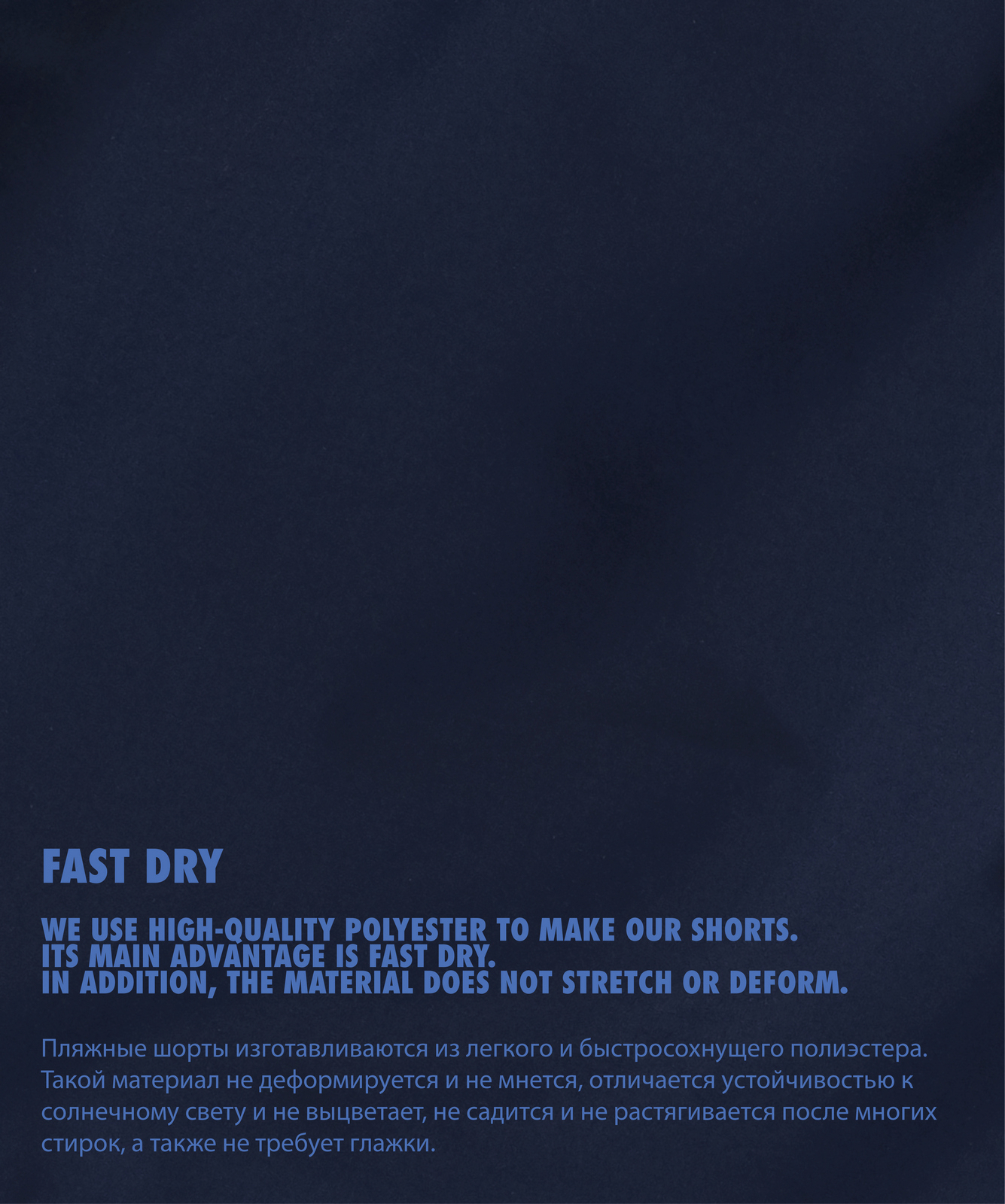 Полиэстер – это высокопрочное, приятное на ощупь, легкое синтетическое волокно, которое не деформируется и не мнется. Изделия из полиэстера после стирок не садятся и не растягиваются, а также быстро сохнут и практически не требуют глажки после стирки. Эта ткань отличается устойчивостью к солнечному свету и не выцветает.