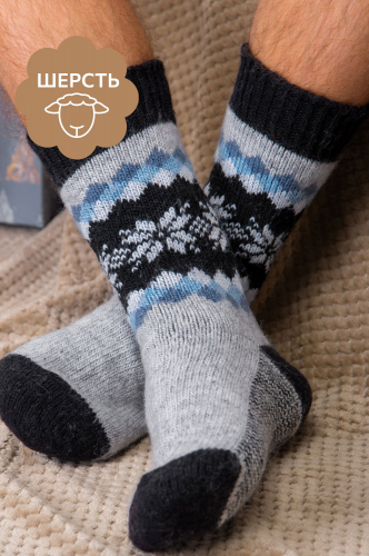 Мужские носки выполнены из мягкой и приятной к телу шерстяной пряжи. Классическая высота и спокойная черно-серая палитра с красивым орнаментом делают вязаные носки стильным и практичным аксессуаром для холодной осени и зимы.