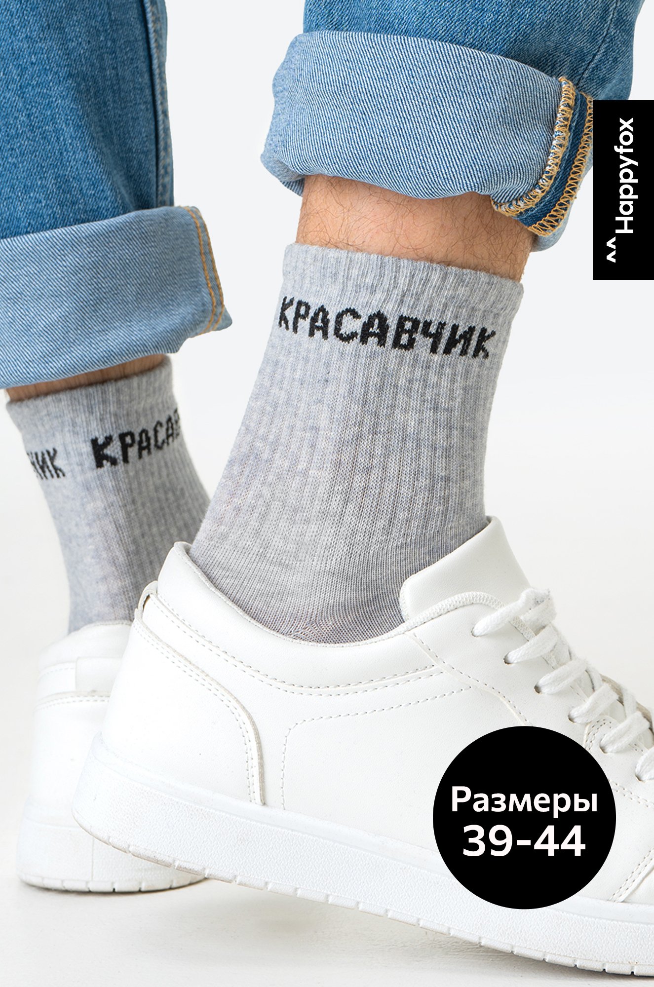 Серые мужские носки с прикольной надписью Красавчик точно поднимут настроение и разбавят повседневные будни! Демисезонная модель средней длины выполнена из смесового трикотажа: хлопок с добавлением эластана для лучшей посадки по ноге.