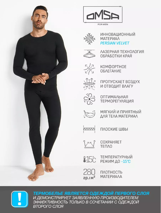 Мужское термобелье OMSA OmU 1612T - облегающий лонгслив с длинным рукавом. Изготовлен из инновационного материала PERSIAN VELVET, который благодаря уникальной структуре волокна и технологии платированного переплетения обладает высокими теплоизоляционными и влагоотводящими свойствами, создает терморегулирующий эффект, отличается легкостью и мягкостью. Технология лазерной обработки края INVISIBLE создает эффект «запечатанной каймы» и позволяет достичь идеального прилегания материала к телу. Плоские швы защищают кожу от натирания. Термо лонгслив комфортно облегает и обеспечивает максимальную свободу движения. Незаметен под одеждой второго слоя. Теплое нательное термобелье подходит для повседневного использования (зимние прогулки и отдых, рыбалка, охота, туризм, поход и др). Технология лазерной обработки края INVISIBLE создает эффект «запечатанной каймы» и позволяет достичь идеального прилегания материала к телу. Плоские швы защищают кожу от натирания. Термо кальсоны комфортно облегают и обеспечивают максимальную свободу движения. Незаметны под одеждой второго слоя. Теплое нательное термобелье подходит для повседневного использования (зимние прогулки и отдых, рыбалка, охота, туризм, поход и др). Модель рекомендовано носить при температурном режиме от +5 до -15°с.