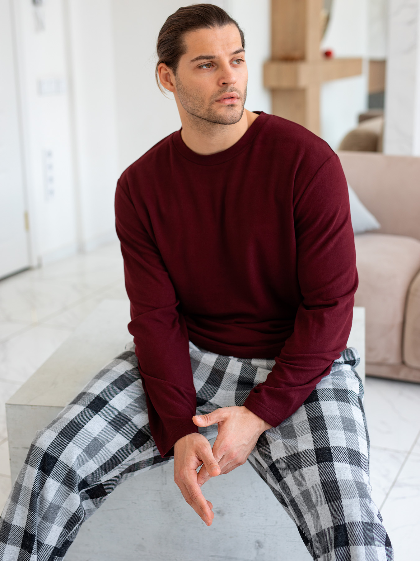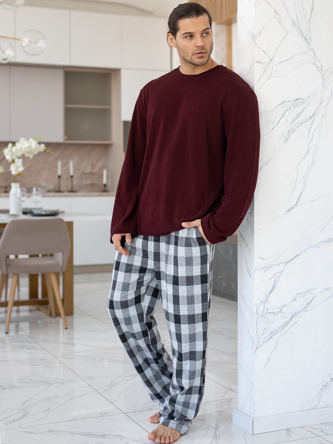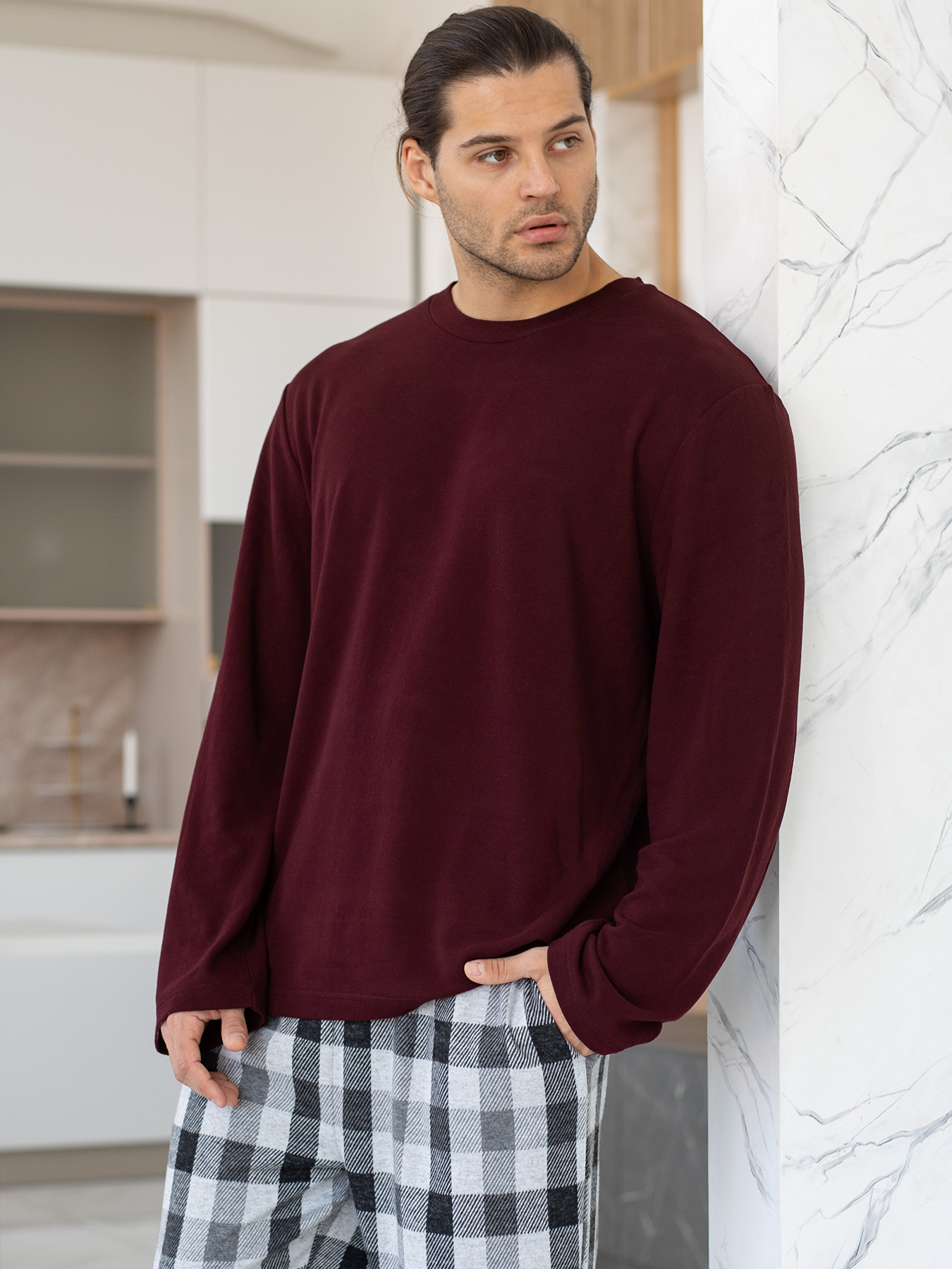 Мужской домашний костюм с брюками и футболкой с длинным рукавом – идеальная одежда для прохладного времени года. Свободные прямые клетчатые брюки из мягкого трикотажа с лёгким ворсом необыкновенно уютны. Пояс на резинке, удобные боковые карманы. Лонгслив выполнен из нежнейшей ткани с содержанием вискозы. Классический силуэт, длинный рукав, округлый вырез горловины, благородные варианты расцветок: винно-красный или цвет индиго – позволяют носить верх от костюма не только дома.