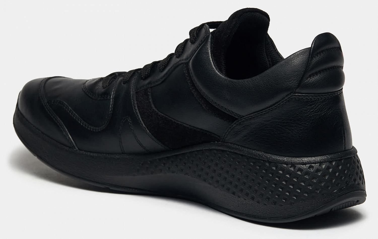 Черные кроссовки STIVEN сшиты из гладкой матовой кожи. Массивная, но при этом легкая подошва амортизирует при ходьбе.