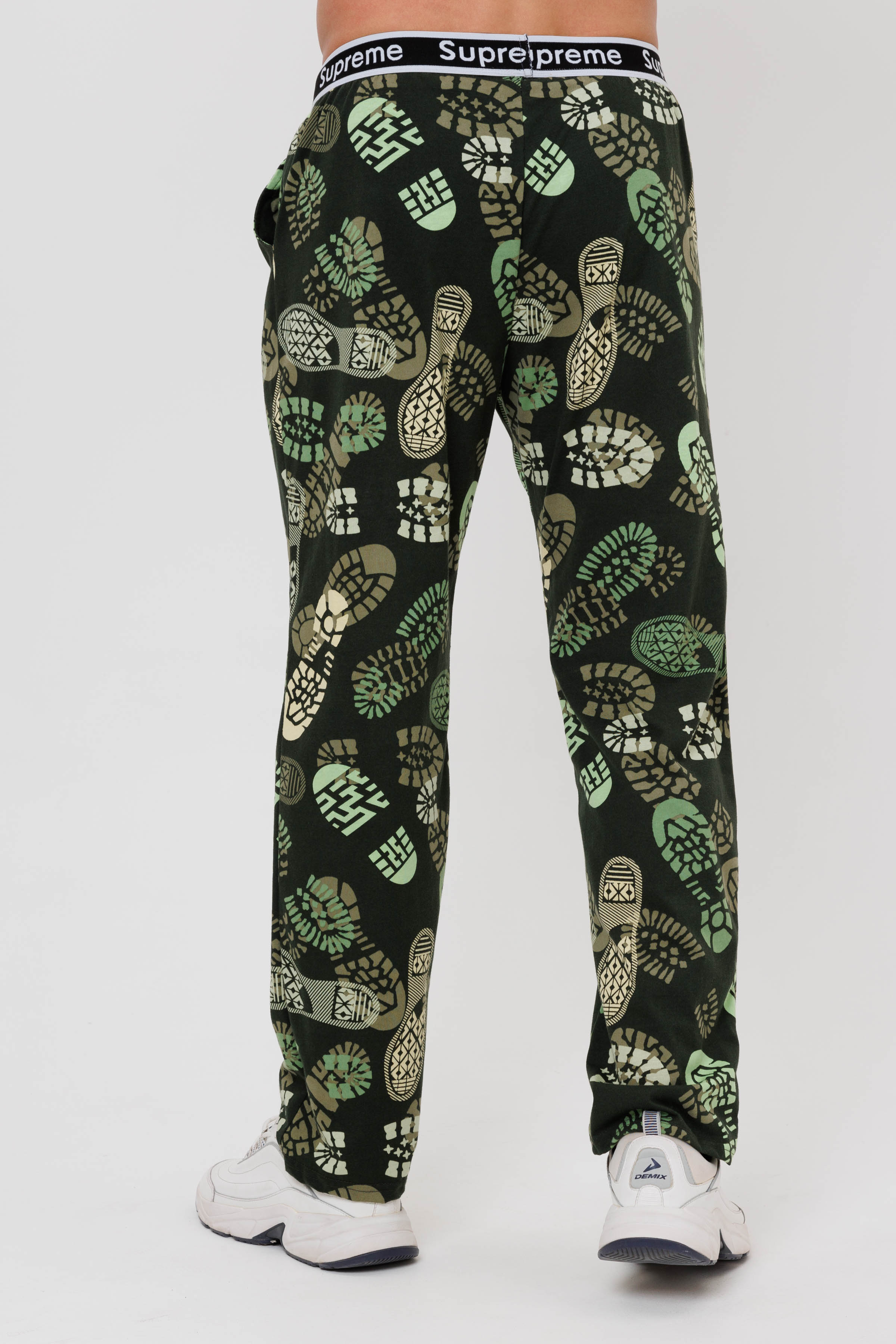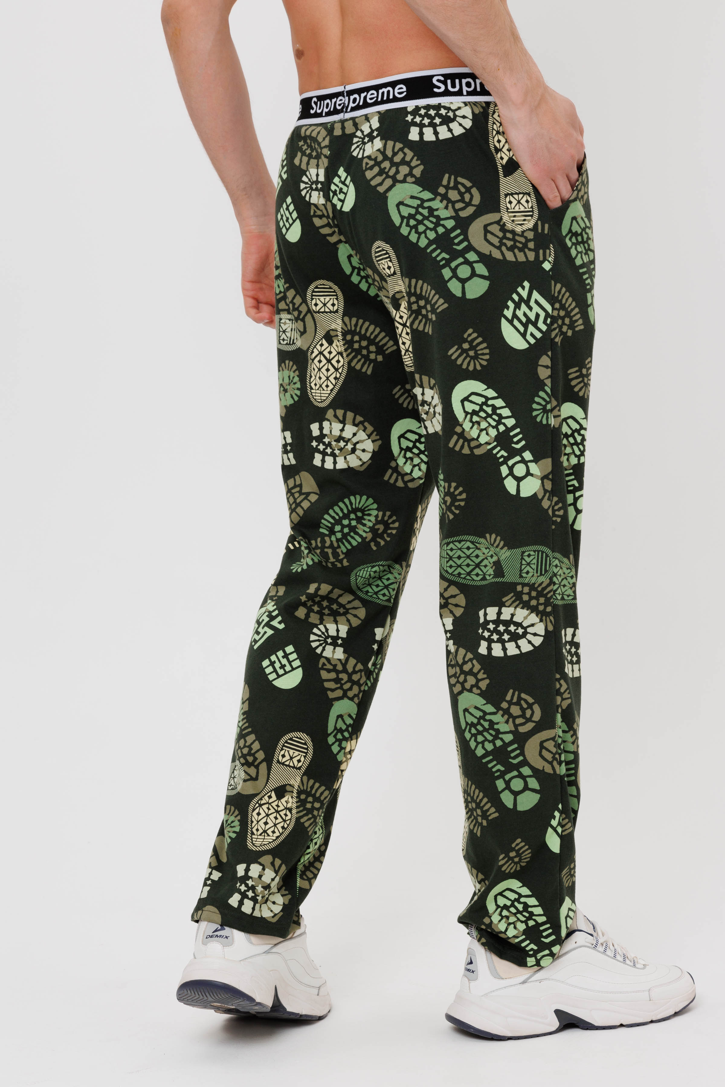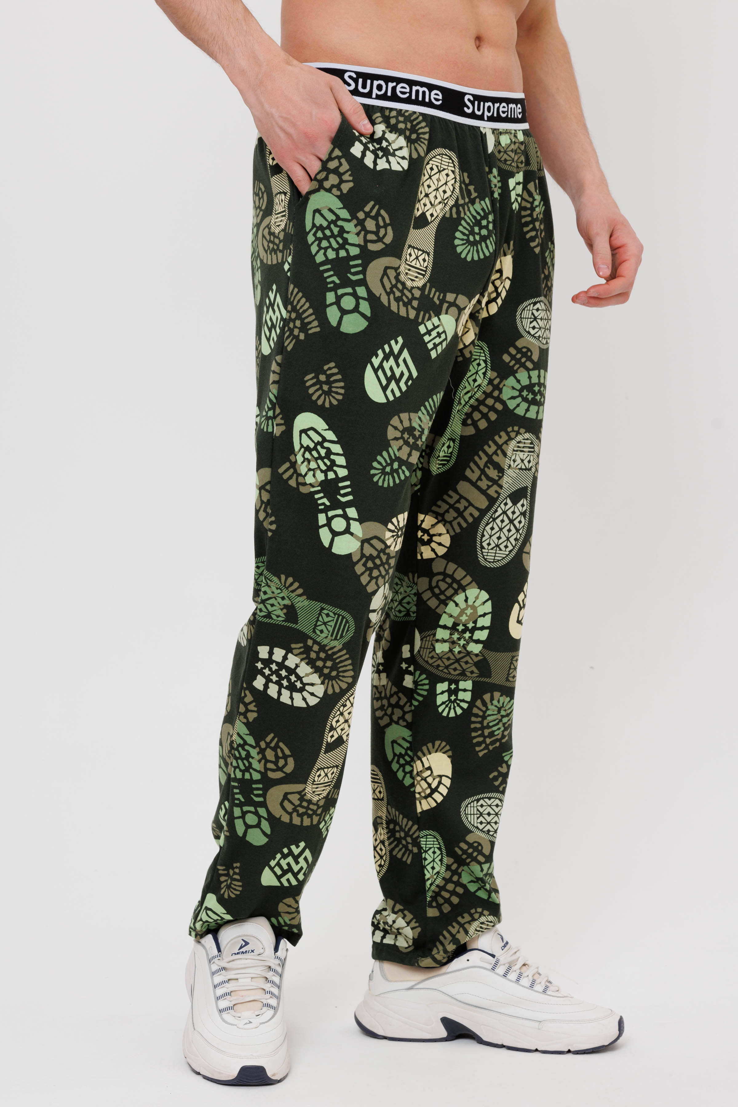Мужские брюки свободного кроя с карманами в боковых швах. Пояс выполнен из ткацкой резинки с принтом.