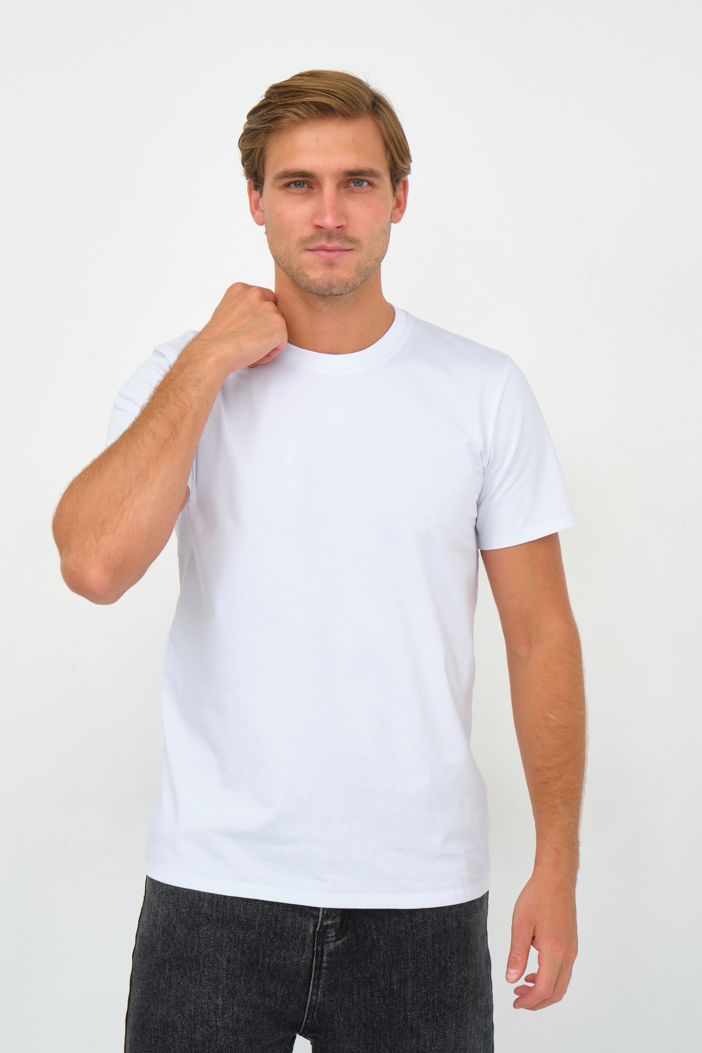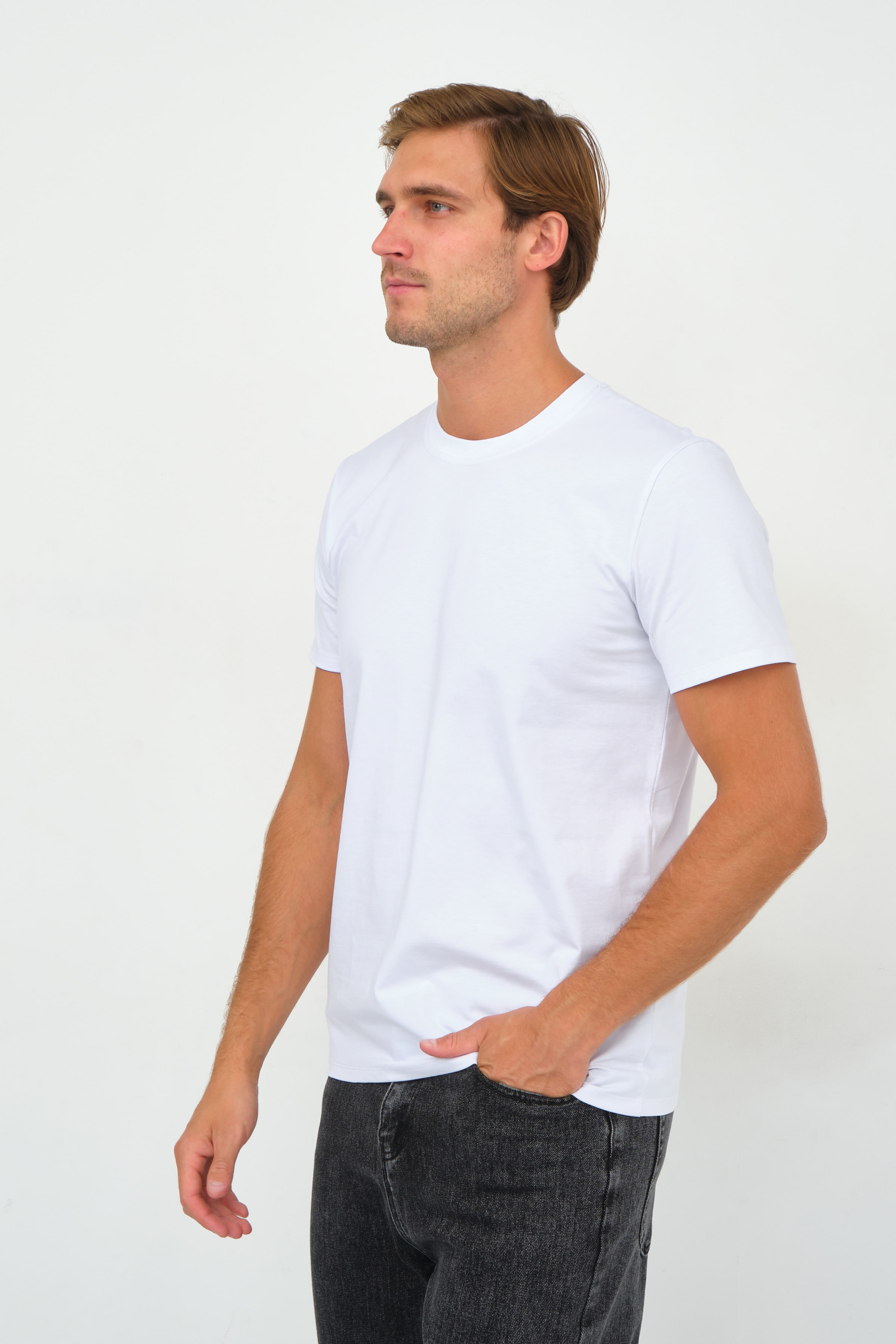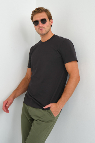 Однотонная базовая модель футболки прямого кроя с коротким рукавом и круглым воротом незаменимый атрибут мужского гардероба.