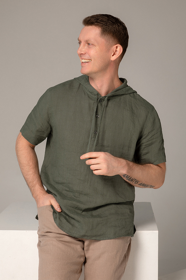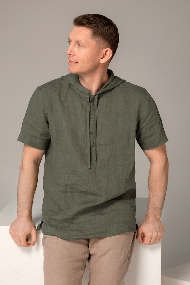 Рубашкой с капюшоном уже никого не удивить. Этот элемент кроя давно мигрировал из верхней одежды в лёгкую, покорил сердца мужчин и женщин, стал атрибутом многих суб культур и модным аксессуаром. Модели с капюшоном всегда привлекают внимание и возбуждают желание примерить. Не отказывайте себе в этом удовольствии! Обратите внимание на представленную модель мужской рубашки. Благодаря короткому рукаву, она составит хорошую конкуренцию футболкам, которые изрядно наскучили. Прямой силуэт подойдёт для самого различного телосложения. Подобный крой лаконично дополняют разрезы в боковых швах. А сдержанная застёжка поло на пуговицы гармонично переходит в тот самый капюшон – «возмутитель спокойствия». Этот элемент задаёт динамику статичному образу и привносит спортивные нотки. И всё это в исполнении натурального льна, жатая текстура которого придаёт неповторимый внешний вид. А свойства этого материала порадуют вас в летний зной.