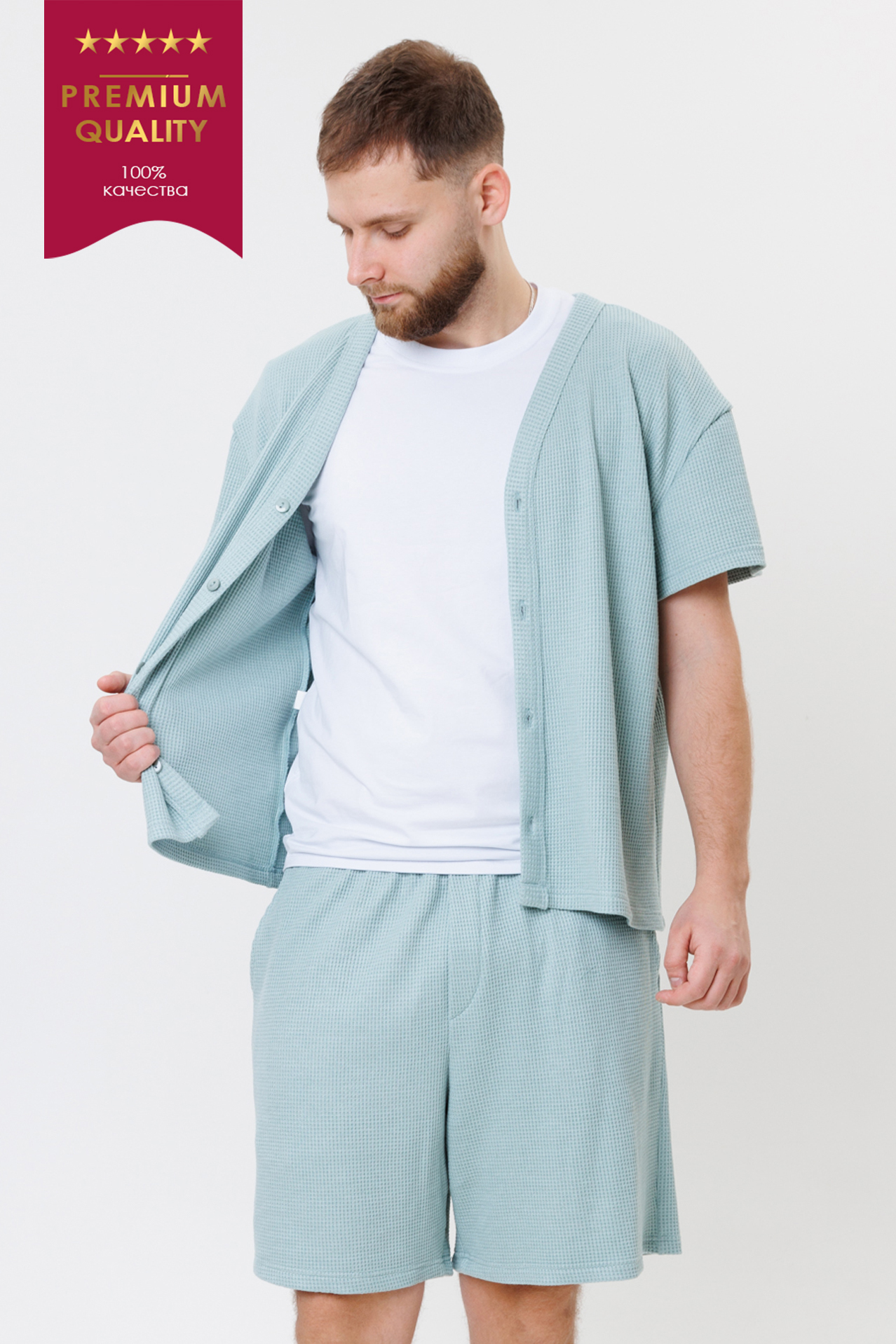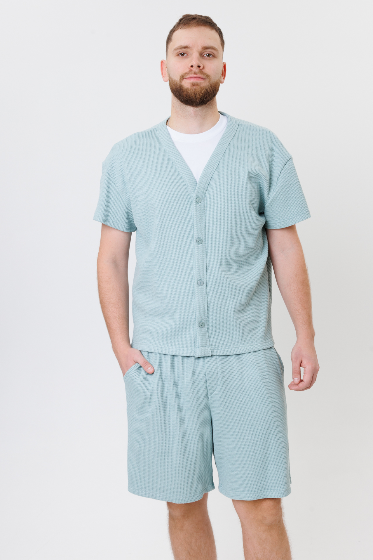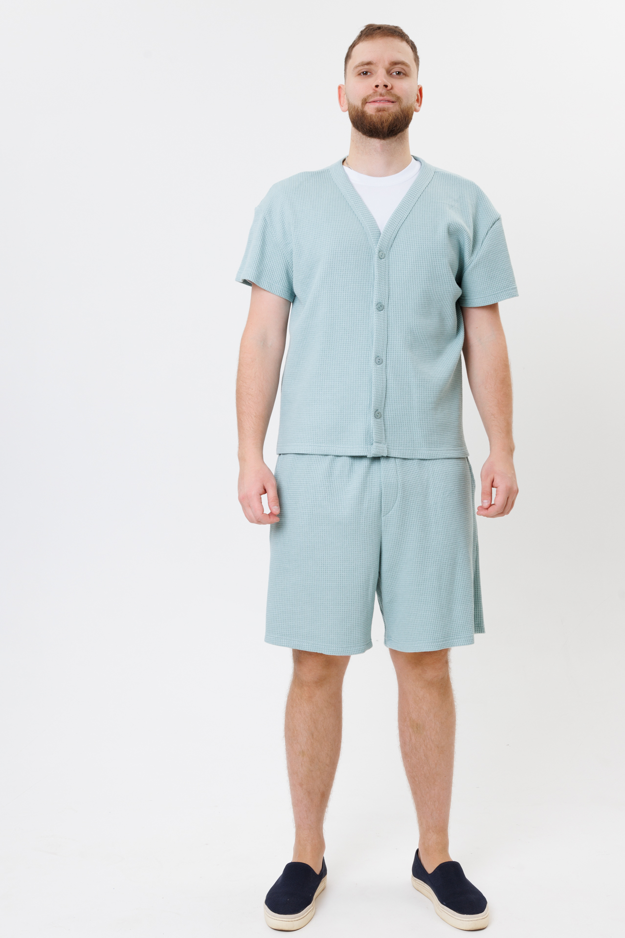 Комплект состоит из рубашки и шорт. Свободная рубашка на пуговицах с V-образным вырезом. Шорты на эластичной резинке. Комплект можно использовать для стильных расслабленных образов как на улице так и дома.