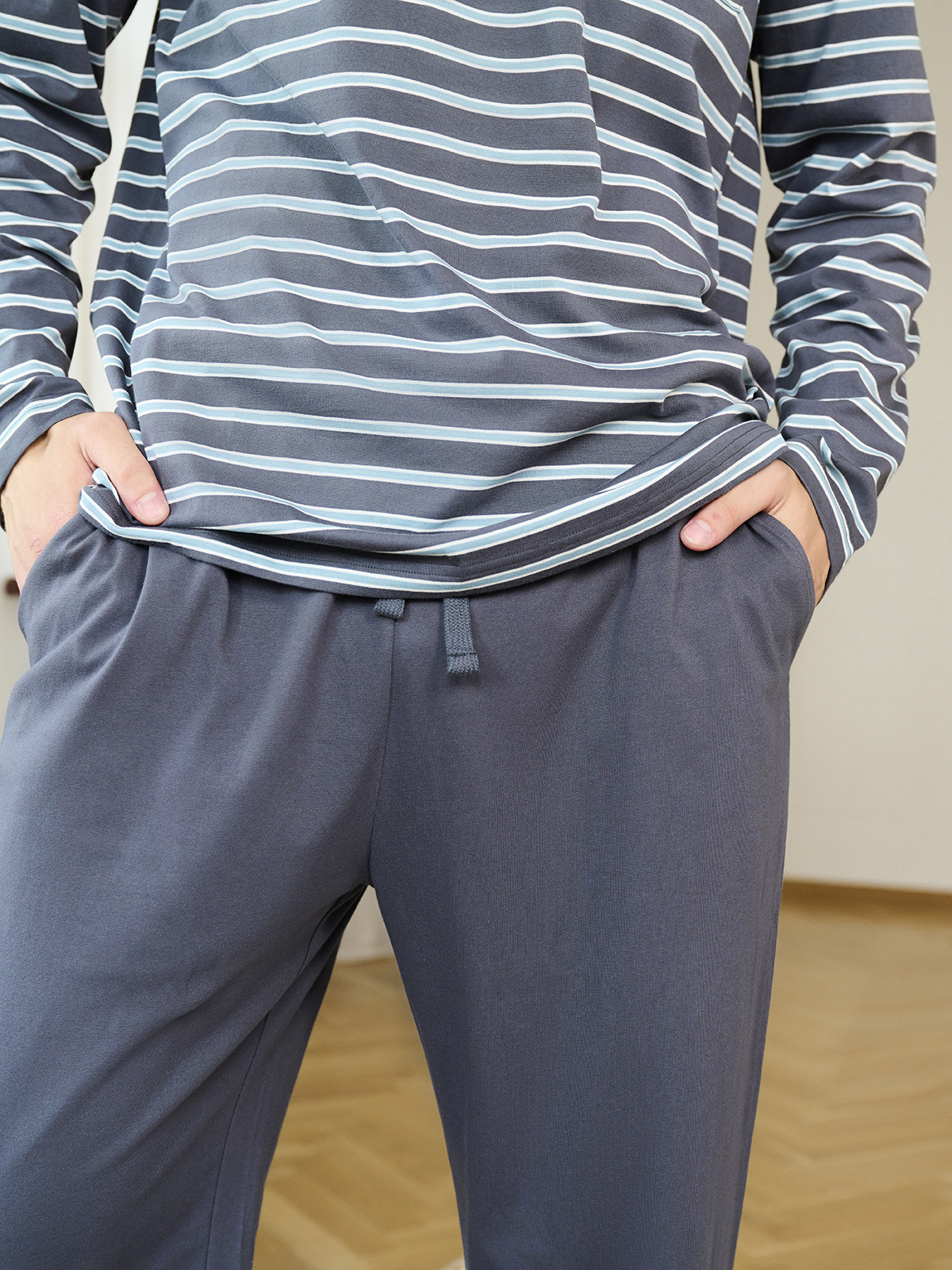 Пижама состоит из лонгслива с длинными рукавами и свободных брюк — классический набор для комфортного отдыха. Выполнена из 100% хлопка: не прилипает к телу, «дышит», не вызывает раздражения.
