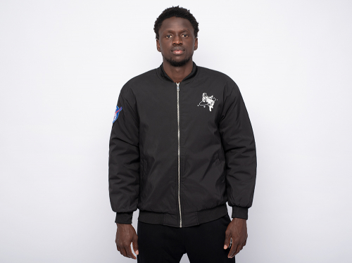 фирменными тремя полосками. На груди, а также на передней части брюк расположен