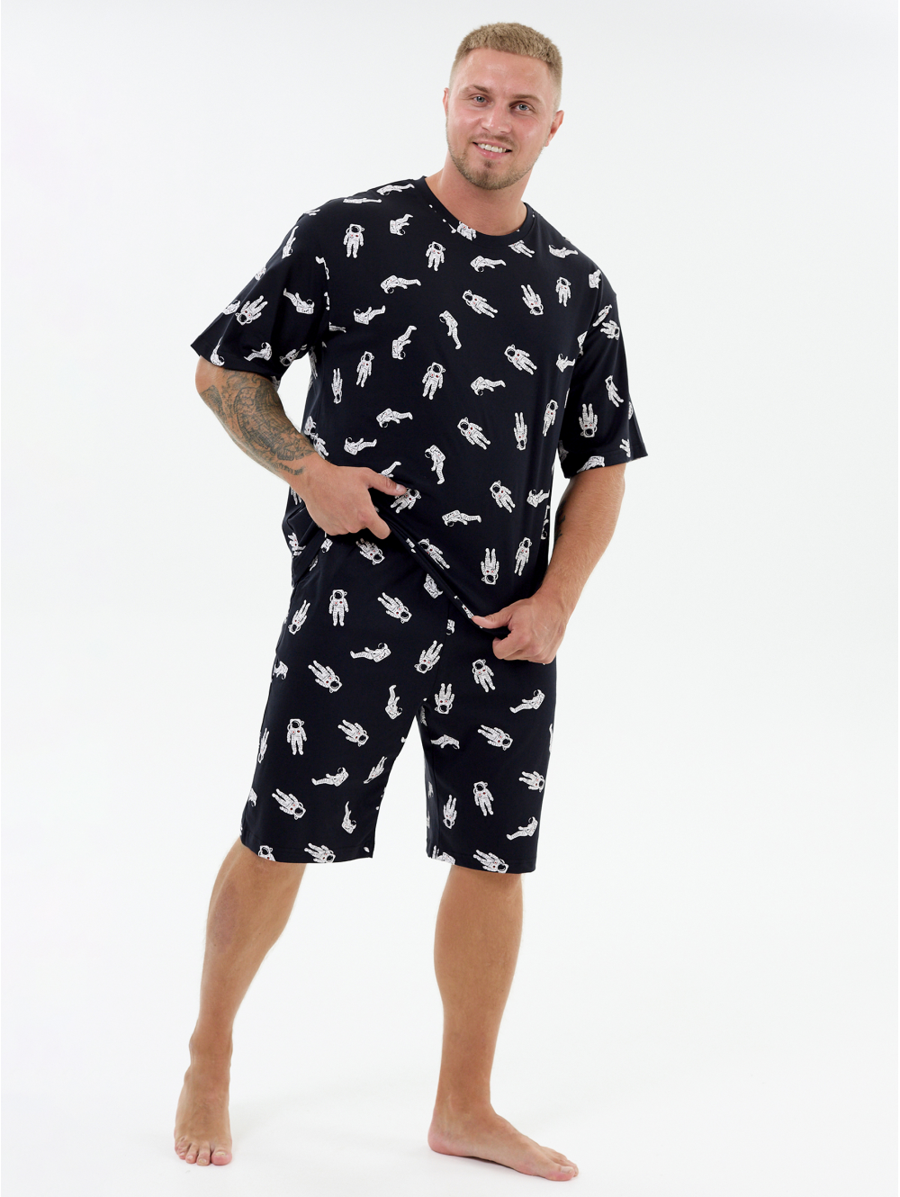 Футболка оверсайз со спущенной линией плеча. Рукава втачные короткие. Шорты мужские полуприлегающие.