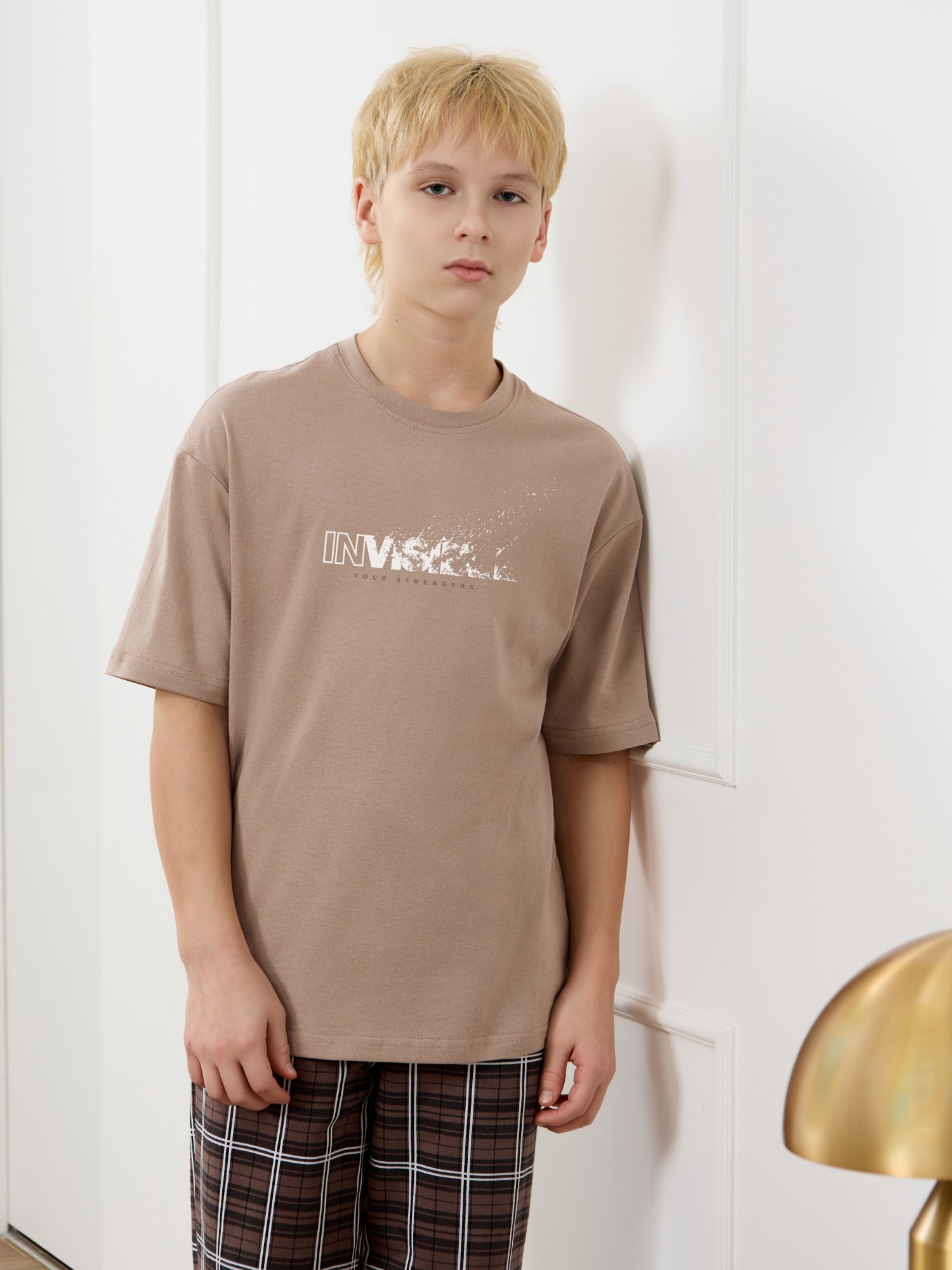 Костюм для мальчика из трикотажного полотна "кулирка", состоящий из футболки и брюк. Футболка классического покроя, с короткими втачными рукавами и приспущенной линией плеч, горловиной овальной формы, обработанной втачной планкой и принтом на детали переда, выполненным в технике шелкографии. Нижние срезы рукавов и изделия обработаны подгибкой. По горловине настрочена отделочная строчка. Брюки - длинные, на притачном поясе с эластичной тесьмой внутри, с карманами в боковых швах. Нижние срезы обработаны подгибкой.