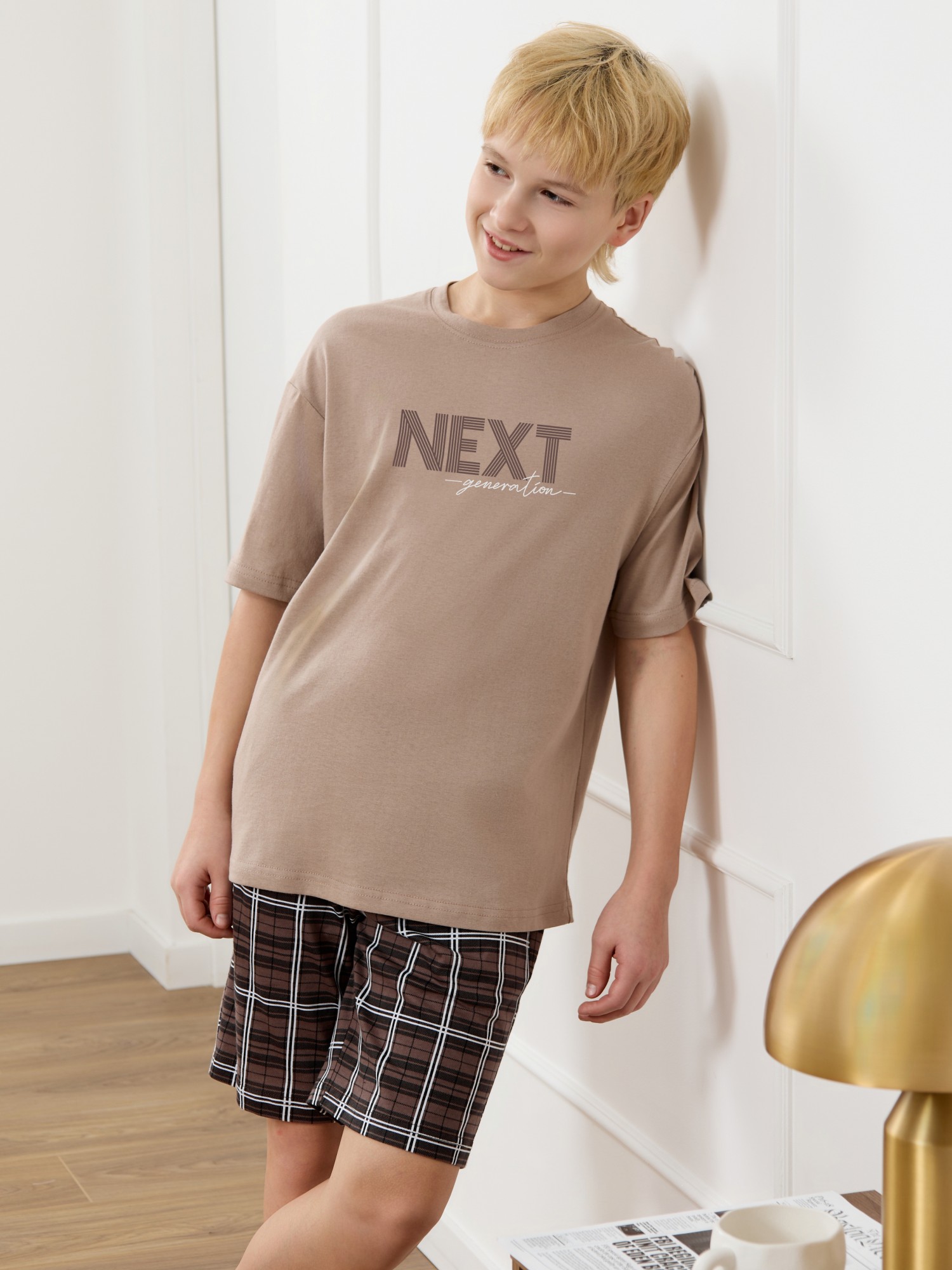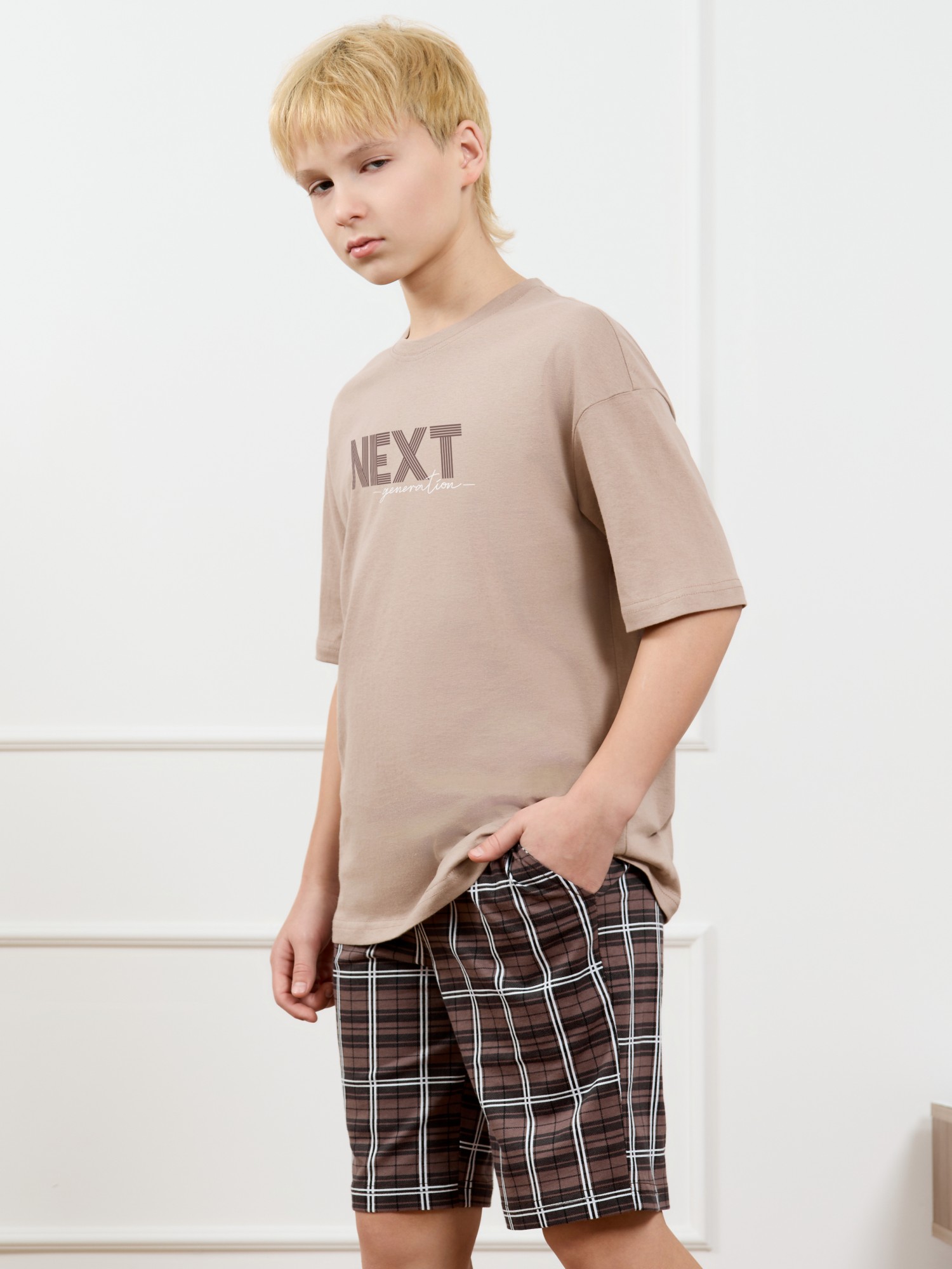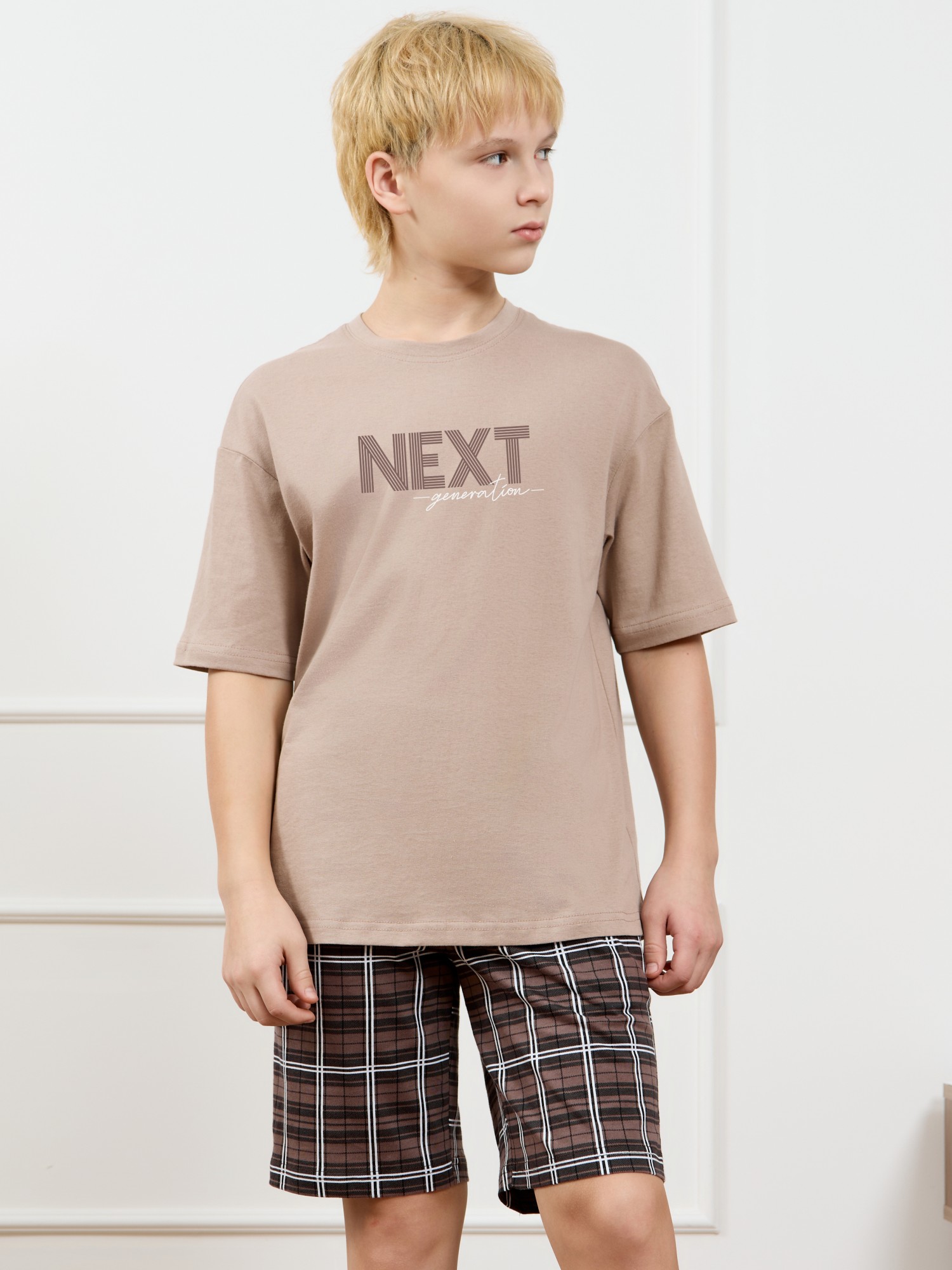 Костюм для мальчика из трикотажного полотна "кулирка", состоящий из футболки и шорт. Футболка классического покроя, с короткими втачными рукавами и приспущенной линией плеч, горловиной овальной формы, обработанной втачной планкой и принтом на детали переда, выполненным в технике шелкографии. Нижние срезы рукавов и изделия обработаны подгибкой. По горловине настрочена отделочная строчка. Шорты длиной до колен, на притачном поясе с эластичной тесьмой внутри, с карманами в боковых швах. Нижние срезы обработаны подгибкой.