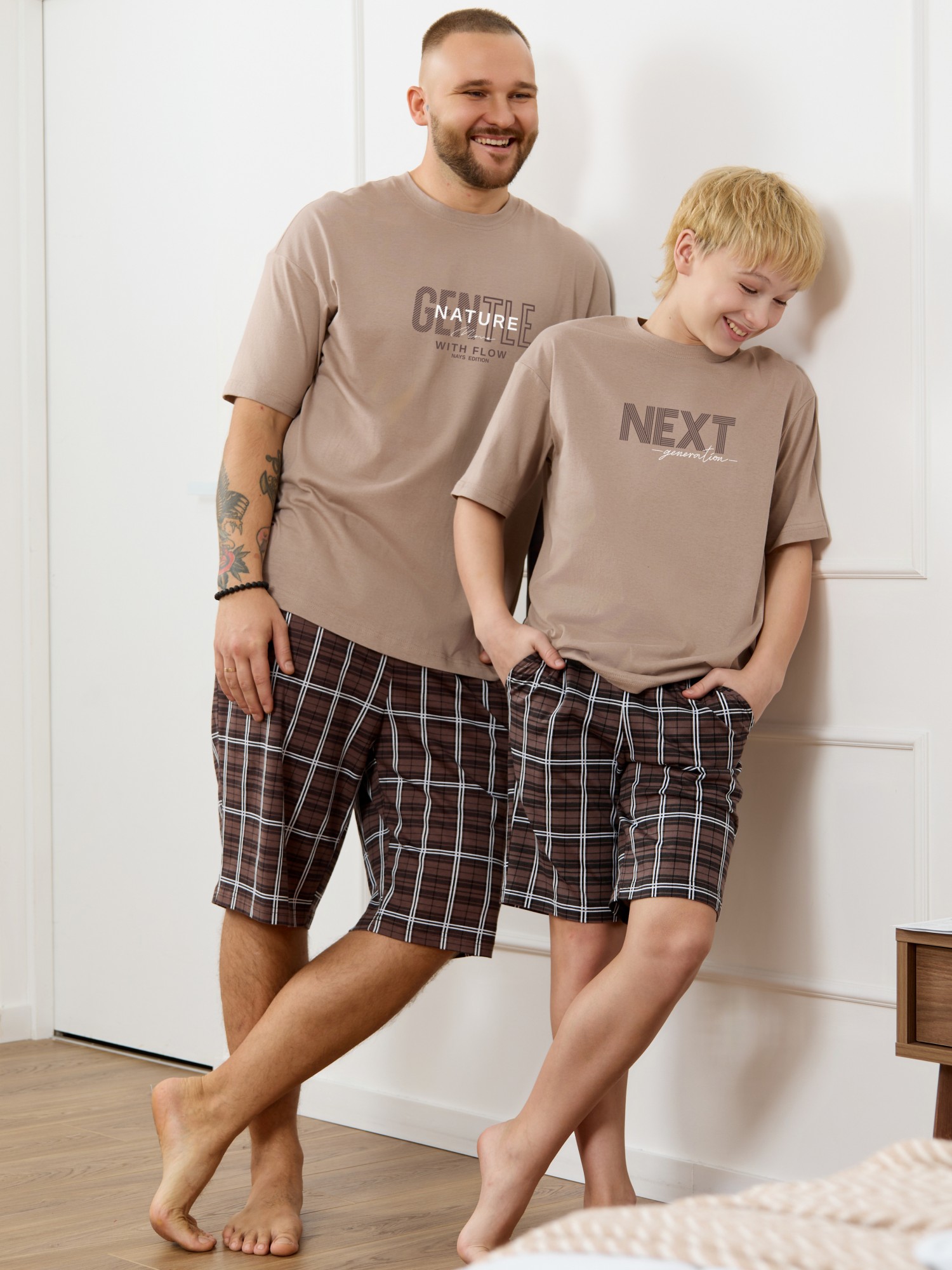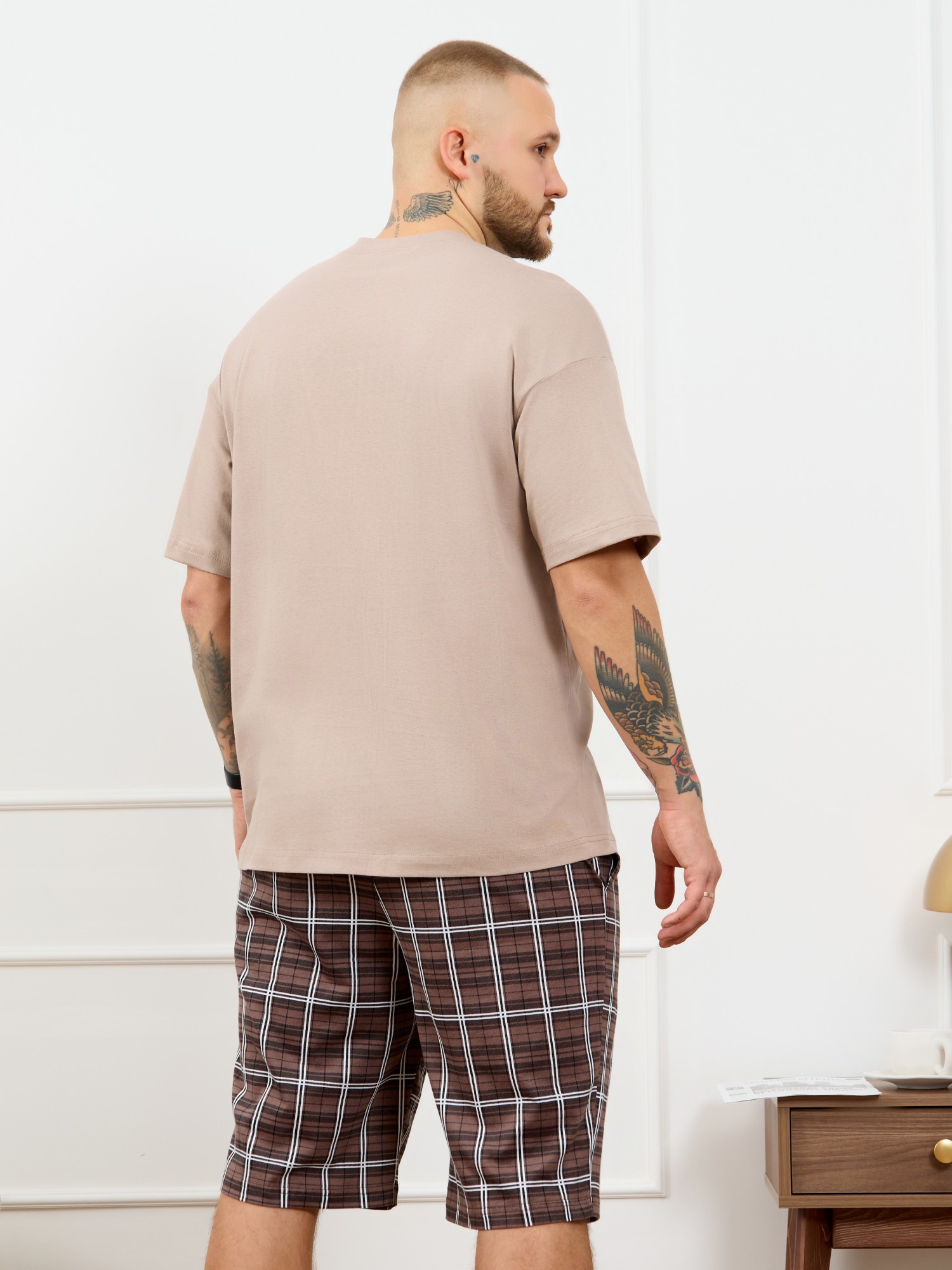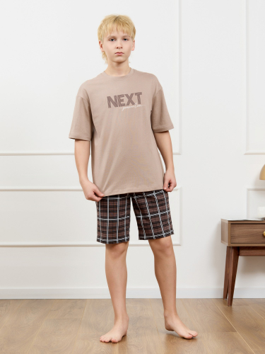 Костю мужской из трикотажного полотна "кулирка", состоящий из футболки и шорт. Футболка классического покроя, с короткими втачными рукавами и приспущенной линией плеч, горловиной овальной формы, обработанной втачной планкой и принтом на детали переда, выполненным в технике шелкографии. Нижние срезы рукавов и изделия обработаны подгибкой. По горловине настрочена отделочная строчка. Шорты длиной до колен, на притачном поясе с эластичной тесьмой внутри, с карманами в боковых швах. Нижние срезы обработаны подгибкой.