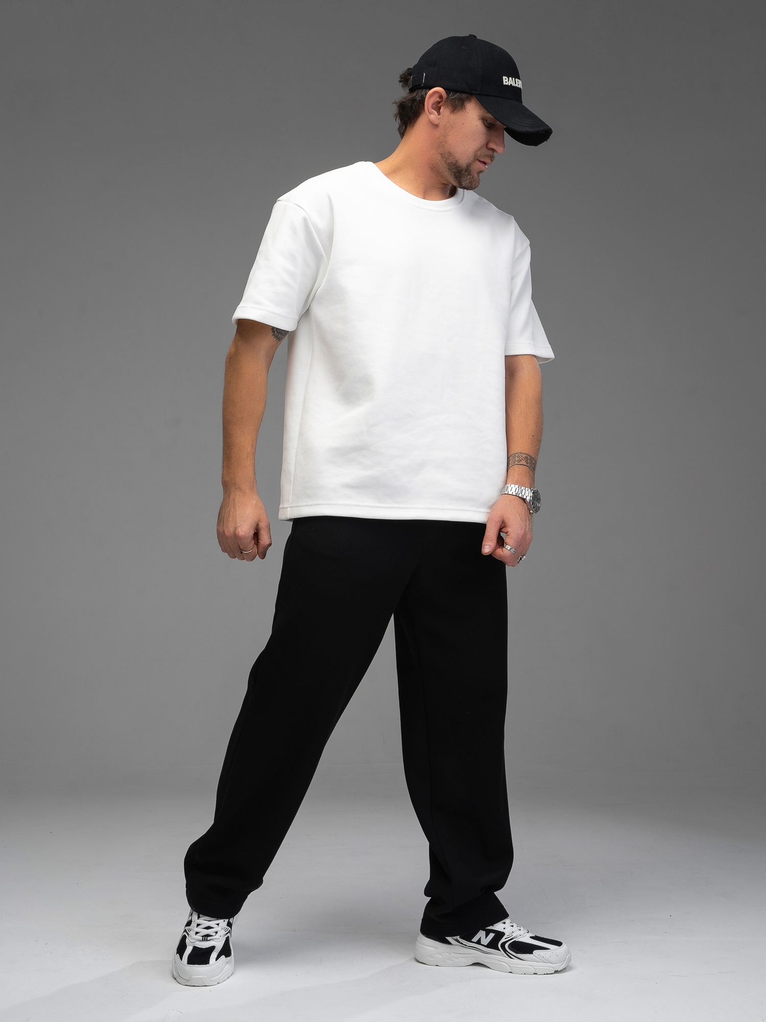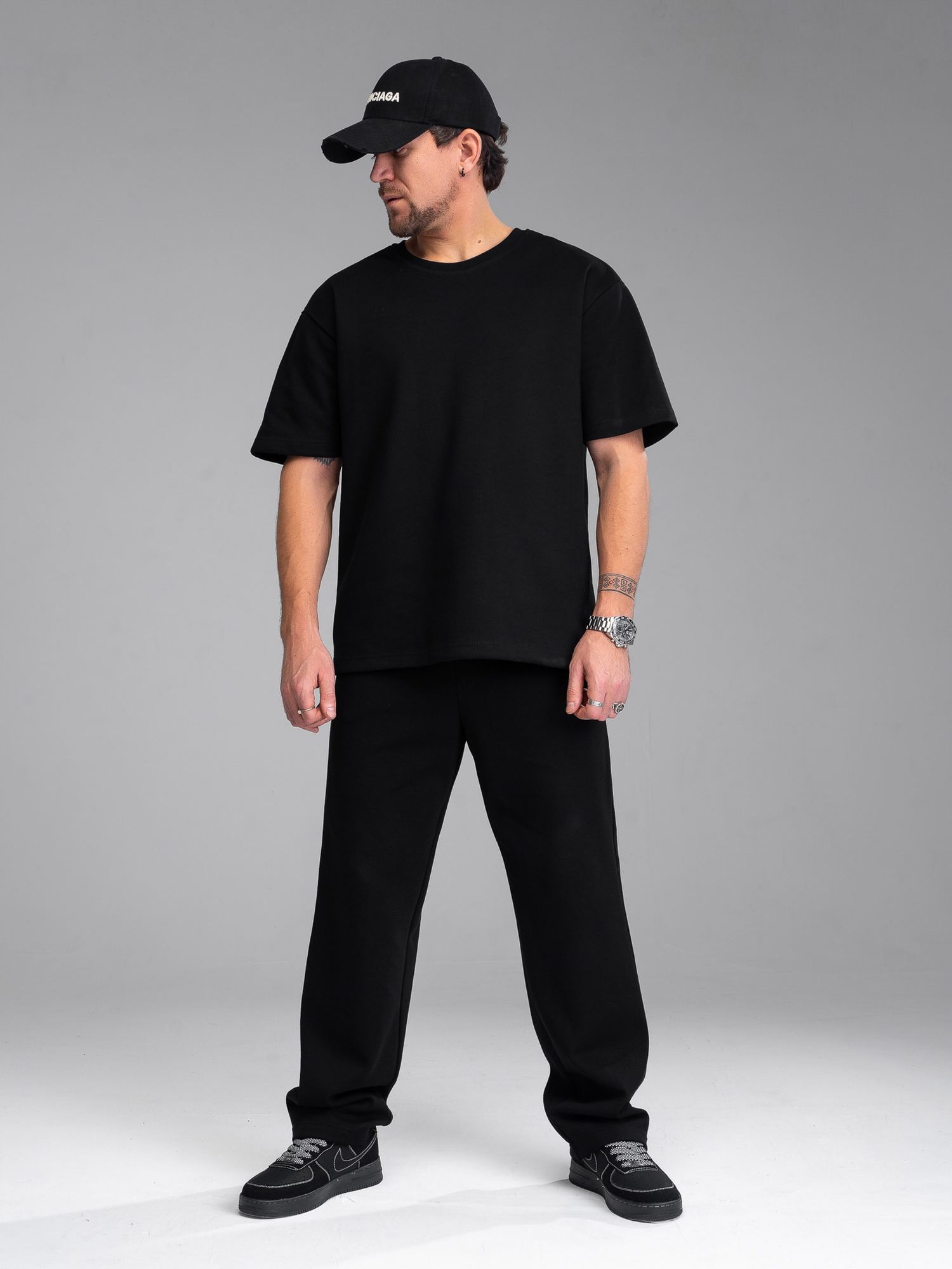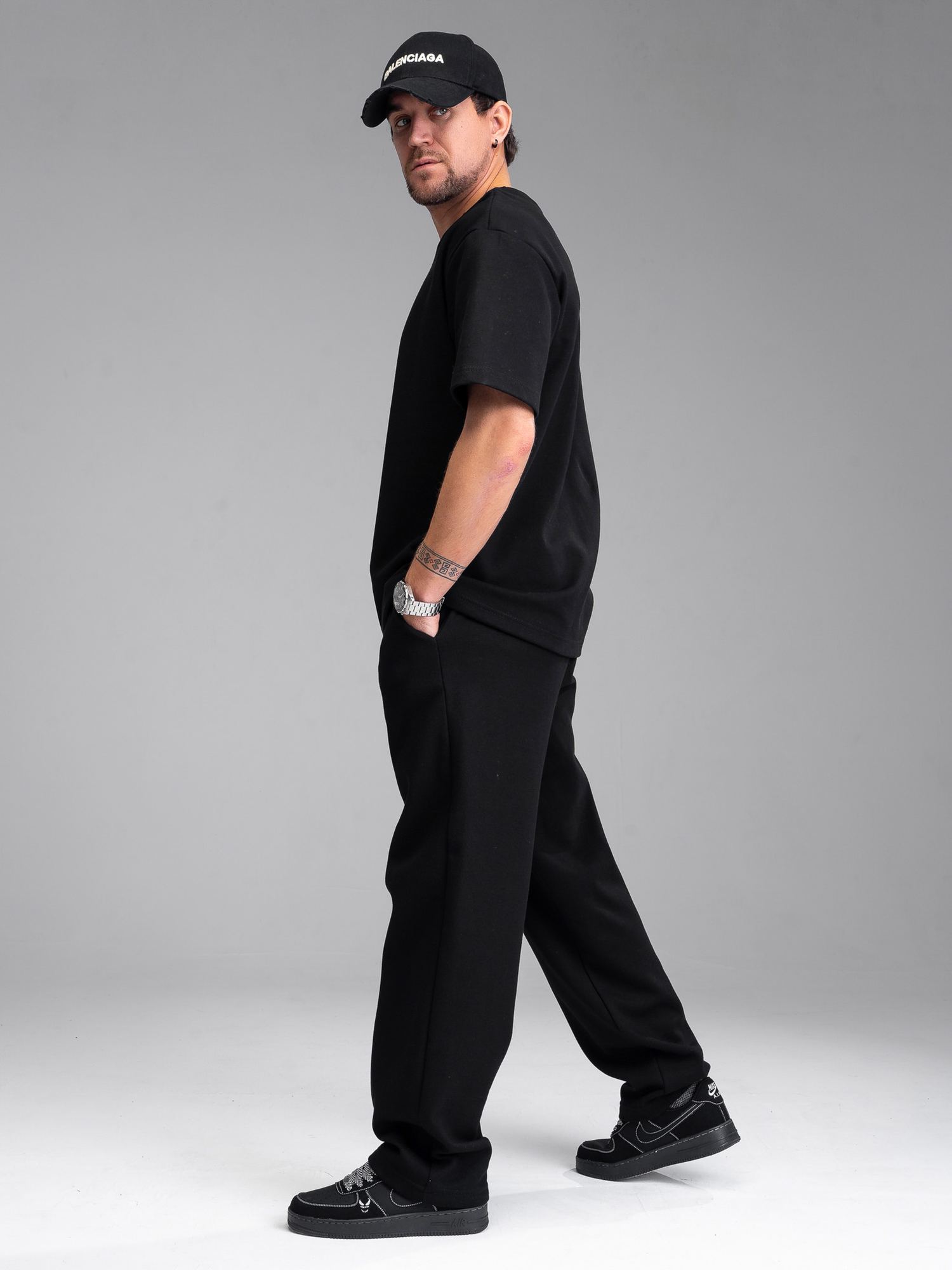 Мужские брюки из пике черного цвета свободного силуэта с широким цельнокроенным поясом и боковыми карманами. Спортивные мужские брюки — ваш выбор для активной жизни!