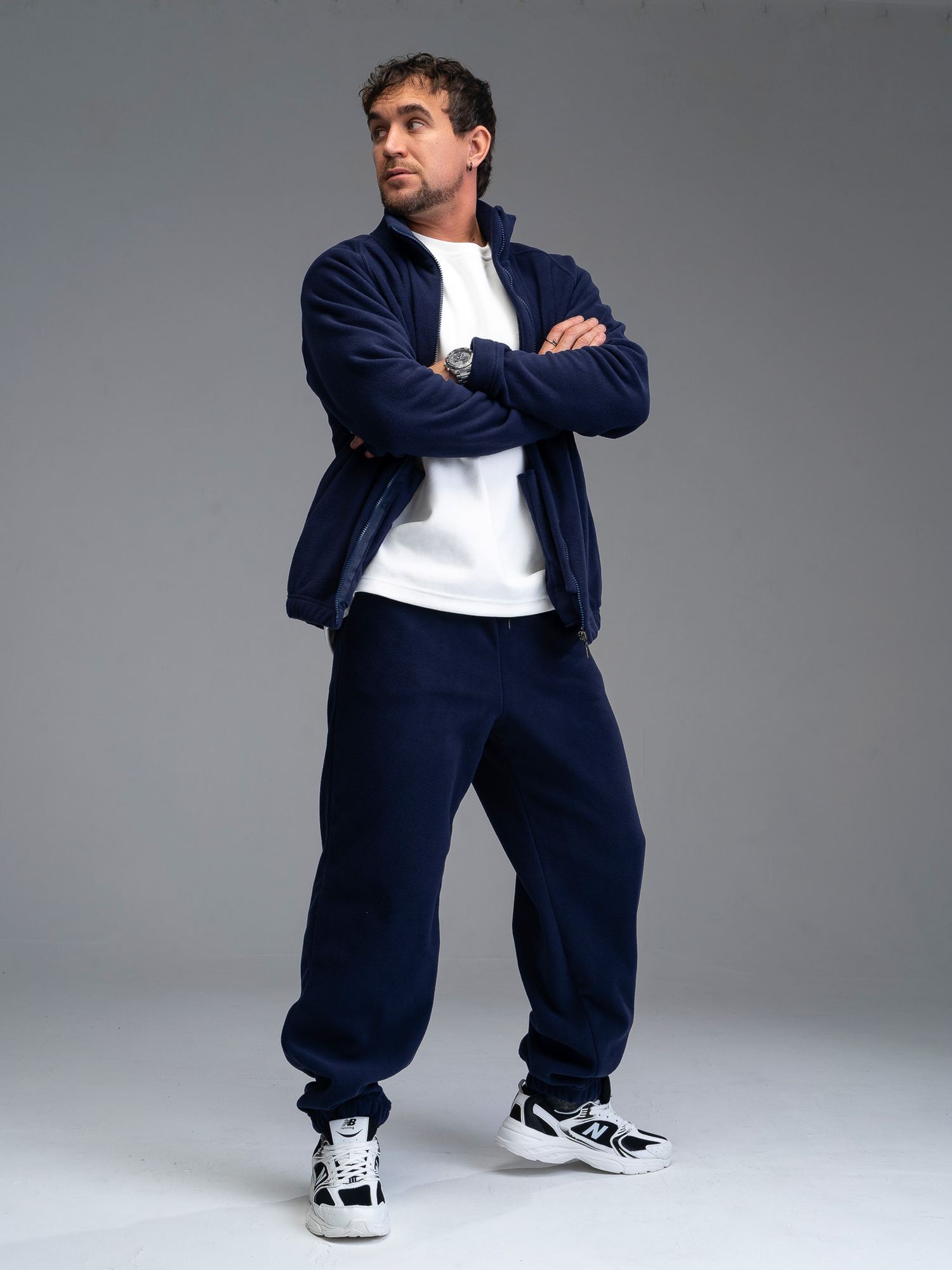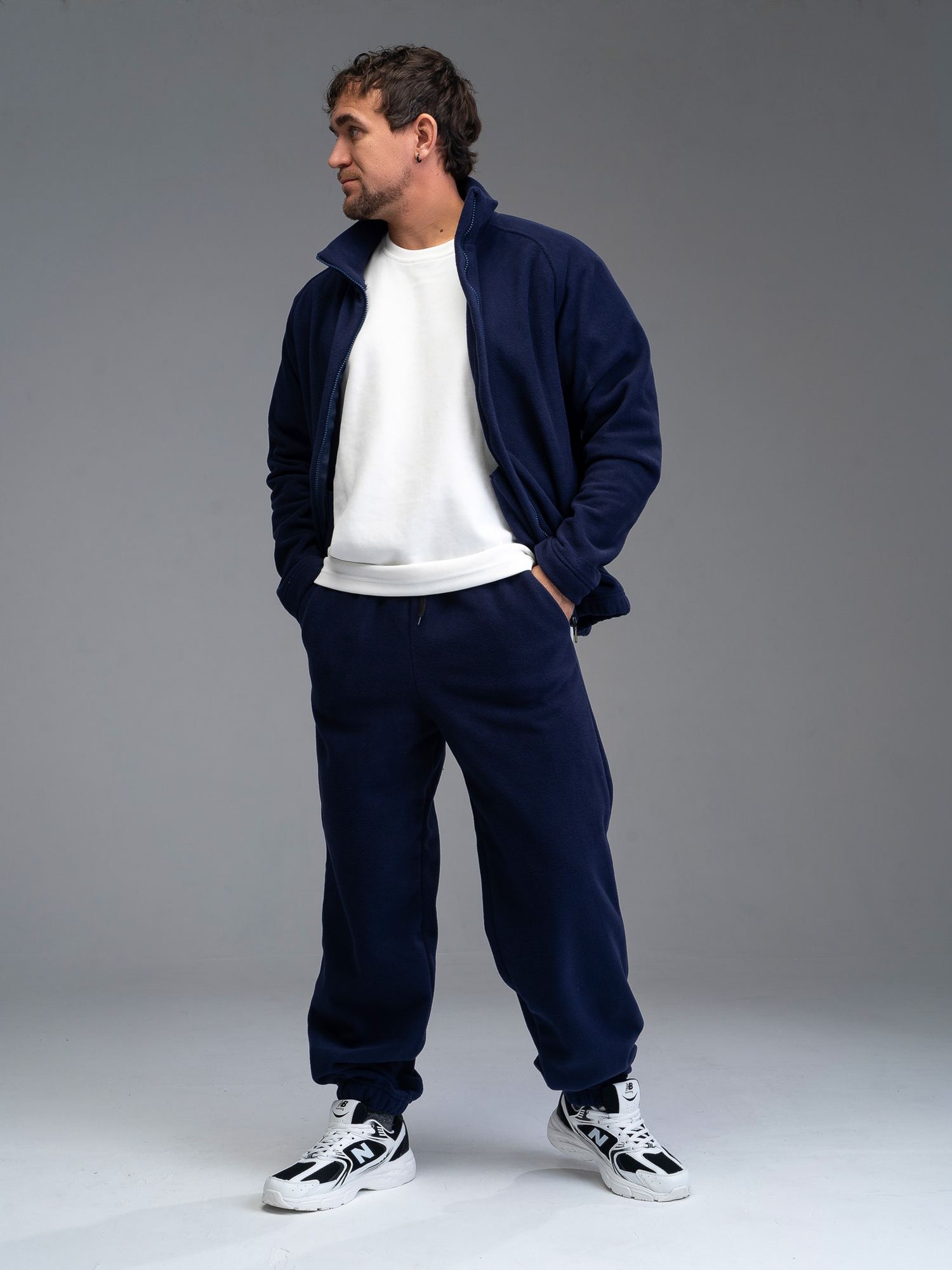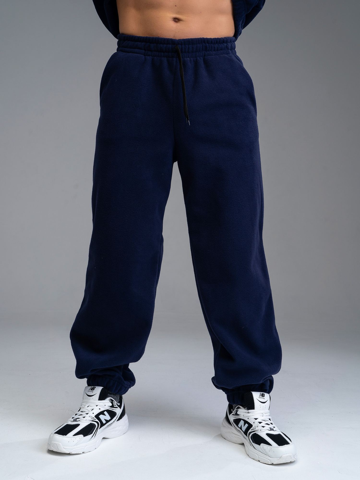 Мужские брюки из флиса темно-синего цвета свободного силуэта с широким цельнокроенным поясом и шнуром, с боковыми карманами.Низ с резинкой .Спортивные мужские брюки — ваш выбор для активной жизни!