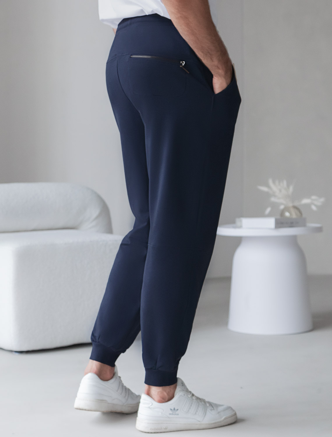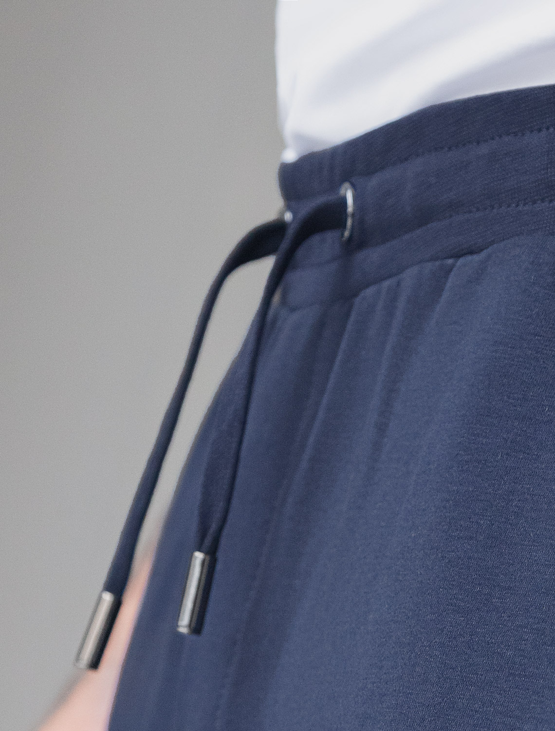 Брюки-джоггеры выполнены из эластичного футера. Изделие с двумя боковыми и одним задним карманом украшено логотипом бренда. Посадка регулируется шнуром, продетым в широкий эластичный пояс. Мягкий и плотный материал хорошо пропускает воздух, а наличие ПЭ в составе способствует формоустойчивости и легкости изделия. Сочетается в костюме с худи U49.039 т.синий
