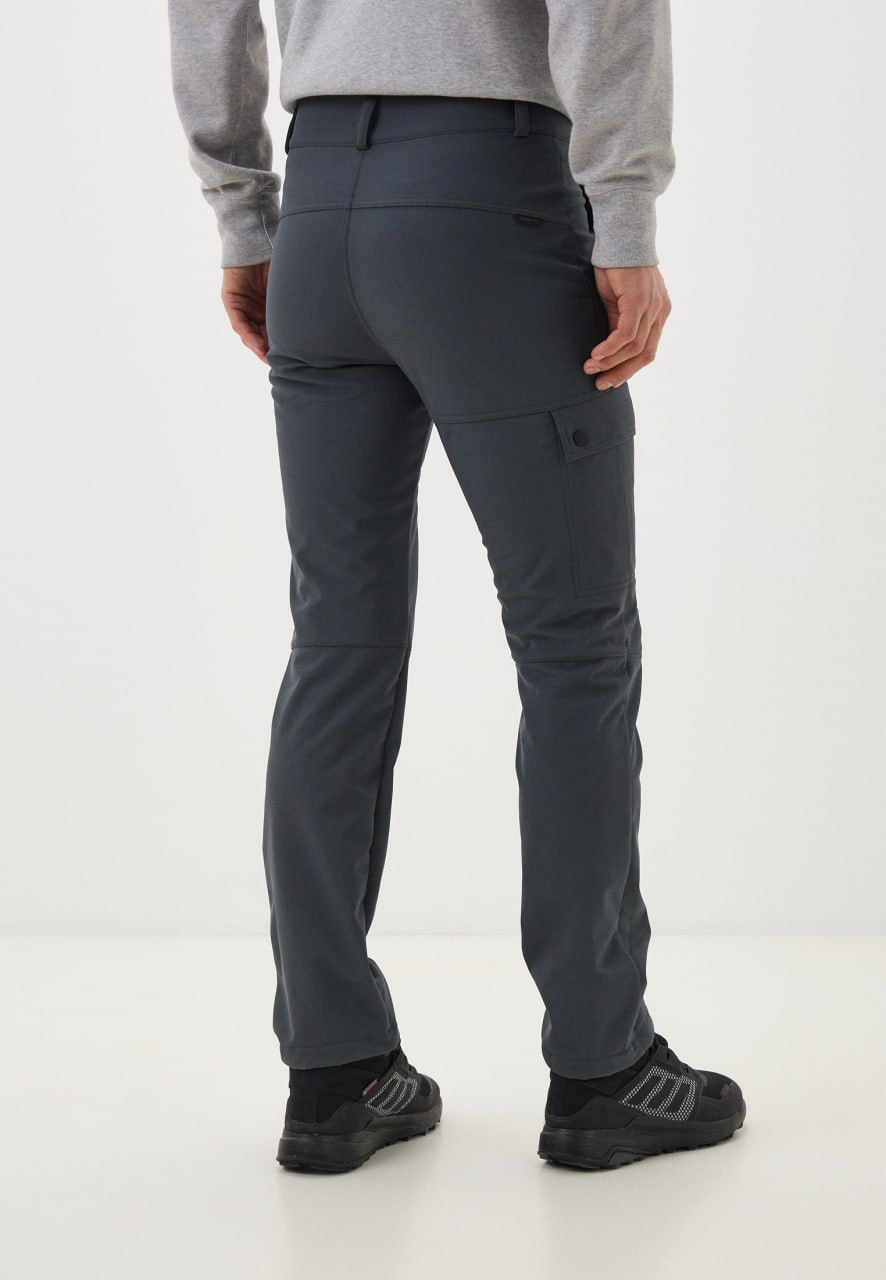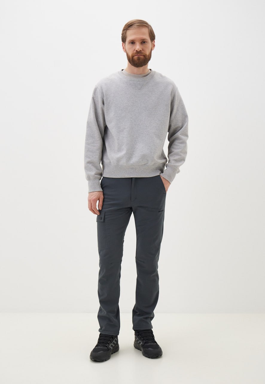 Мужские брюки из софтшелла с кокеткой сзади, с гульфиком на молнии. Отрезной пояс брюк застегивается на пуговицу. 2 верхних боковых  кармана. 1 нижний прорезной карман с клапаном на кнопках. Низ брюк прямой. Рассчитаны на температуру от +5 до +15.