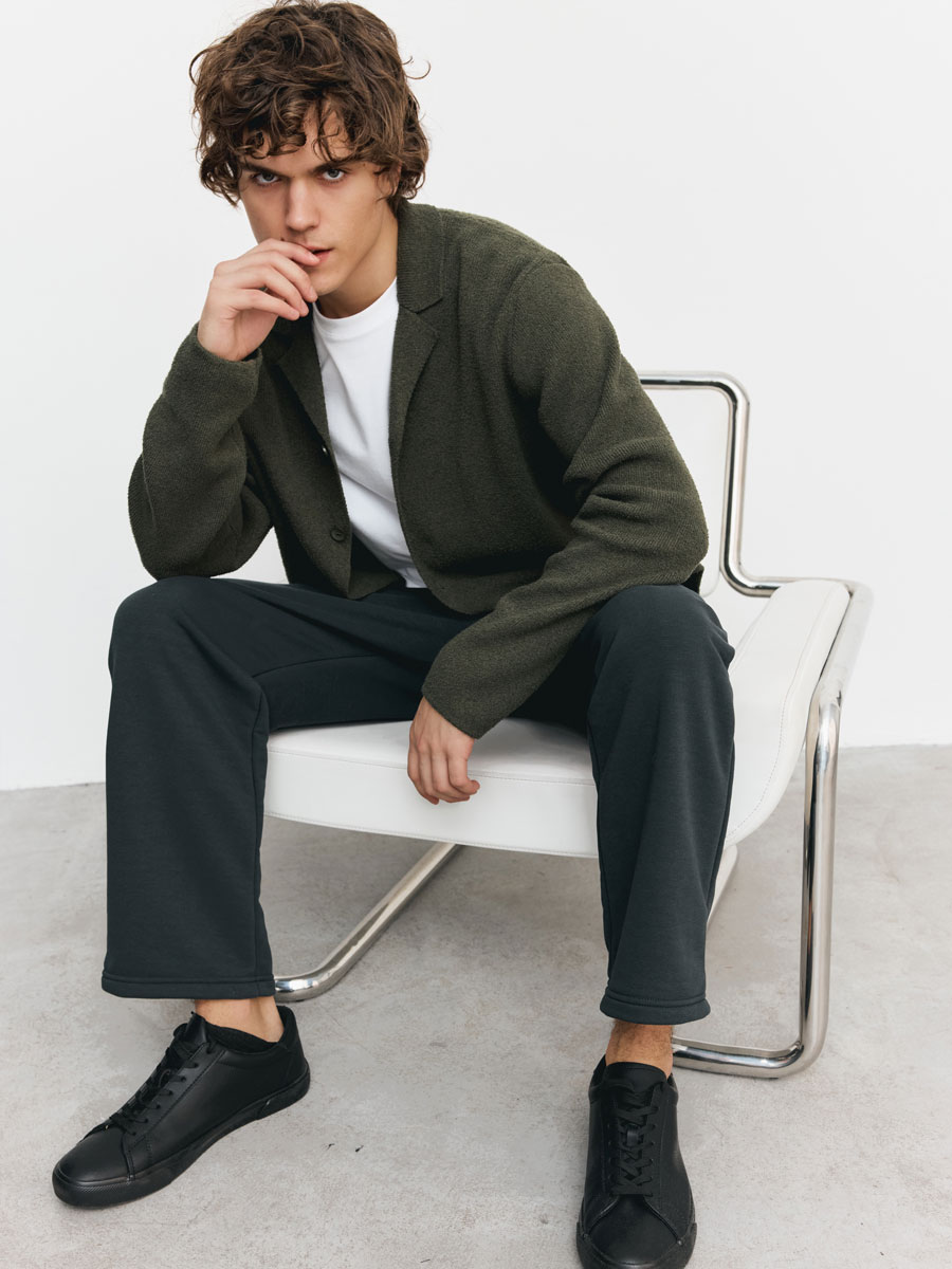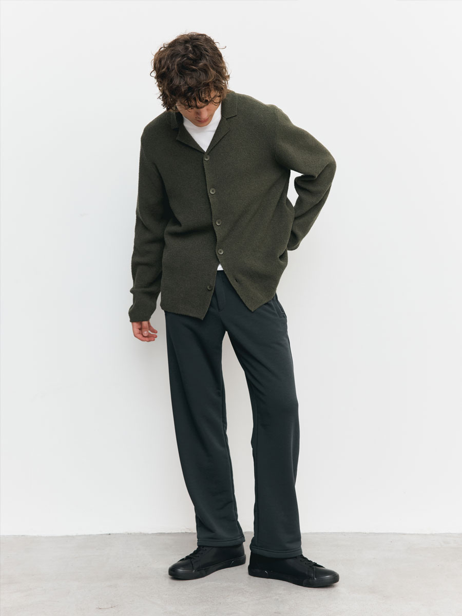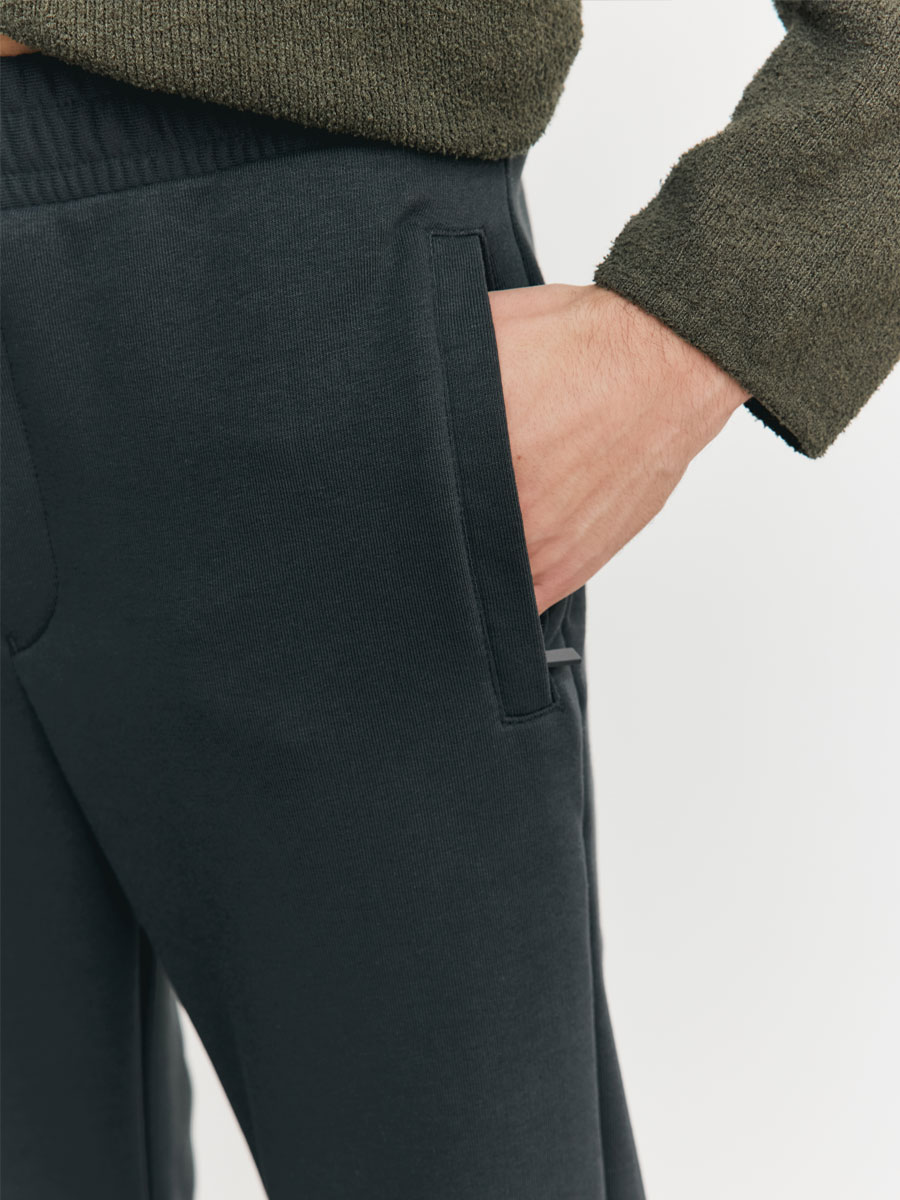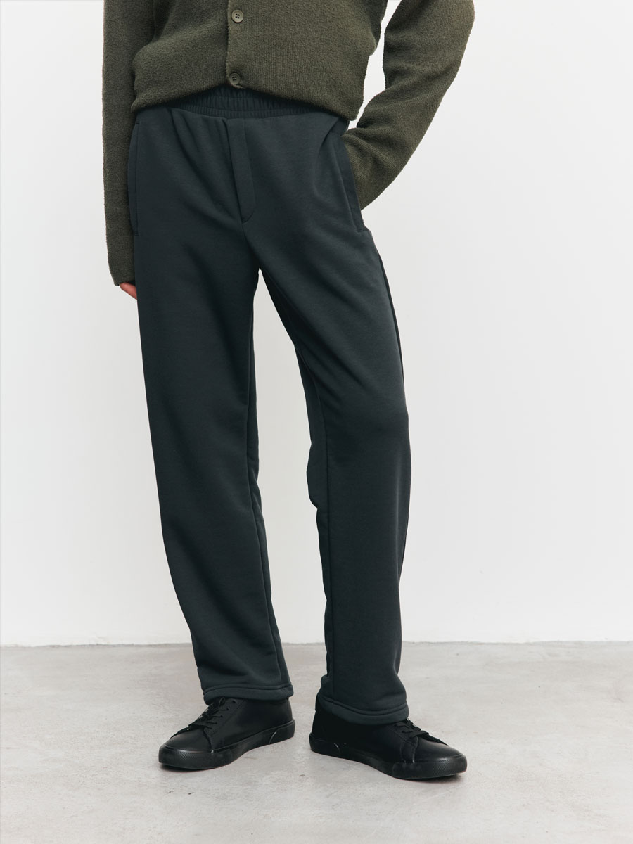 Мужские брюки из футера 3-х нитка петля, прямые, с отрезным поясом, строчёным с эластичной тесьмой. В пояс брюк через петли продет шнур. Карманы прорезные с листочками на молниях. На левой половинке брюк – имитация гульфика.