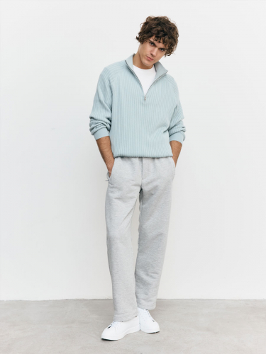 Мужские брюки из футера 3-х нитка петля, прямые, с отрезным поясом, строчёным с эластичной тесьмой. В пояс брюк через петли продет шнур. Карманы прорезные с листочками на молниях. На левой половинке брюк – имитация гульфика.