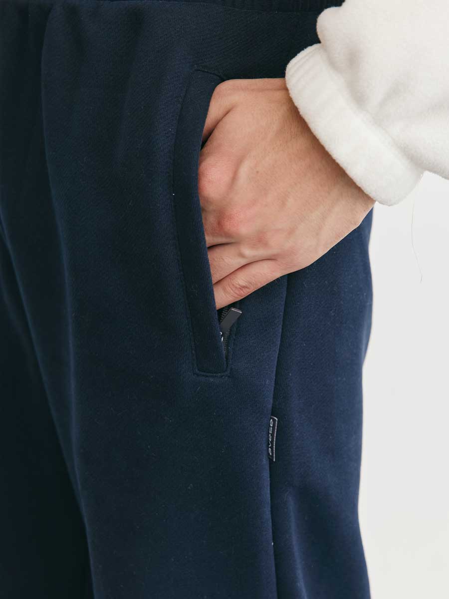 Мужские брюки из футера 3-х нитка диагональ микро-начес с "эффектом велюра", с отрезным поясом, строчёным с эластичной тесьмой. С изнаночной стороны пояса петли, через которые продет шнур. Карманы прорезные с листочками на молниях. На правой задней половинке брюк – накладной карман.