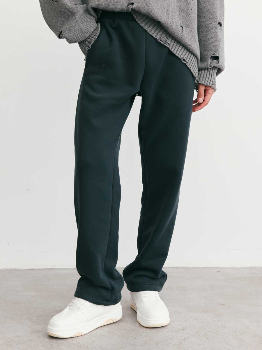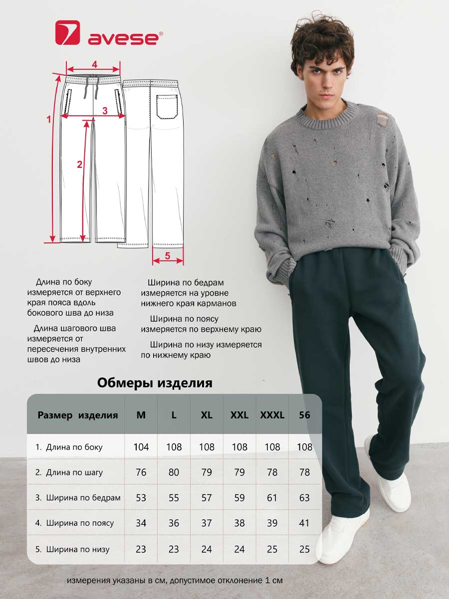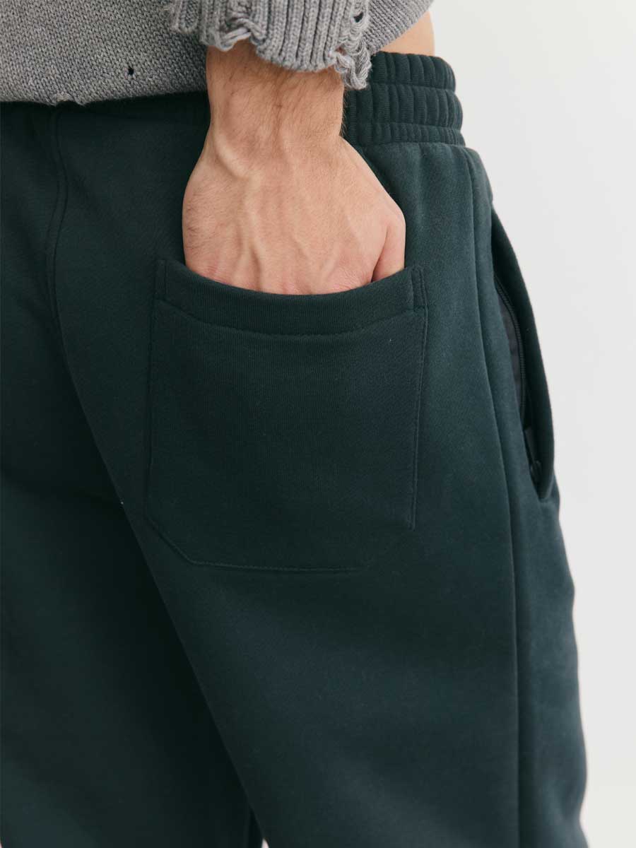 Мужские брюки из футера 3-х нитка диагональ микро-начес с "эффектом велюра", с отрезным поясом, строчёным с эластичной тесьмой. С изнаночной стороны пояса петли, через которые продет шнур. Карманы прорезные с листочками на молниях. На правой задней половинке брюк – накладной карман.