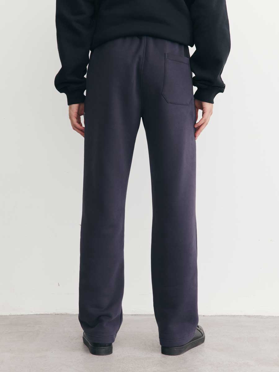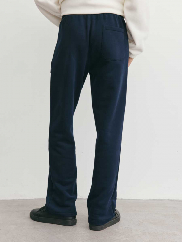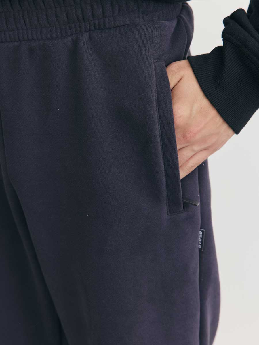 Мужские брюки из футера 3-х нитка диагональ микро-начес с "эффектом велюра", с отрезным поясом, строчёным с эластичной тесьмой. С изнаночной стороны пояса петли, через которые продет шнур. Карманы прорезные с листочками на молниях. На правой задней половинке брюк – накладной карман.