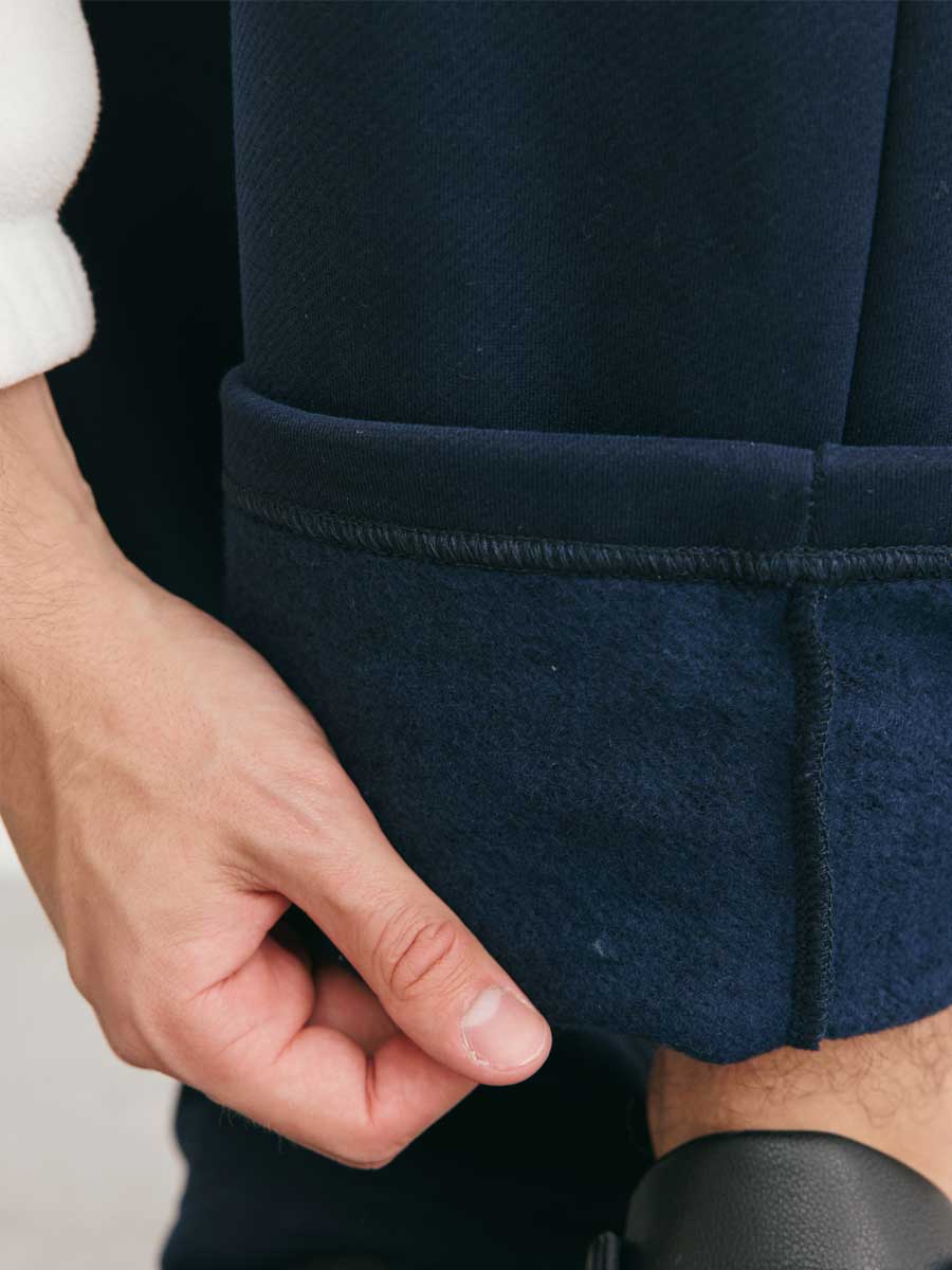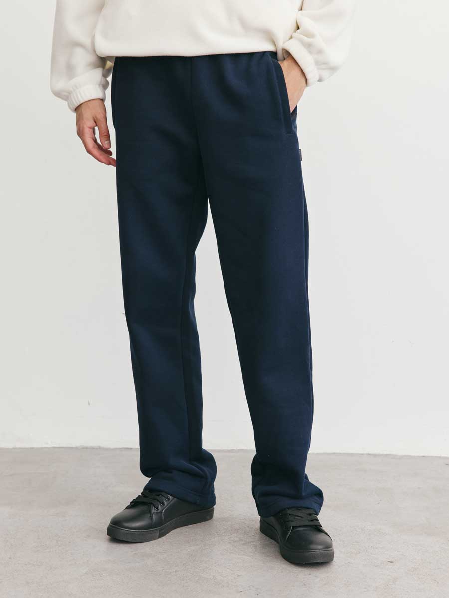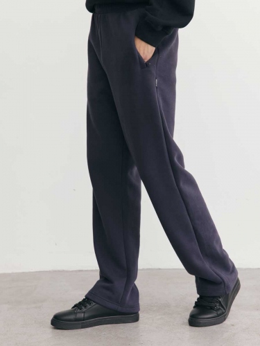 Мужские брюки из футера 3-х нитка диагональ микро-начес с "эффектом велюра", с отрезным поясом, строчёным с эластичной тесьмой. С изнаночной стороны пояса петли, через которые продет шнур. Карманы прорезные с листочками на молниях. На правой задней половинке брюк – накладной карман.