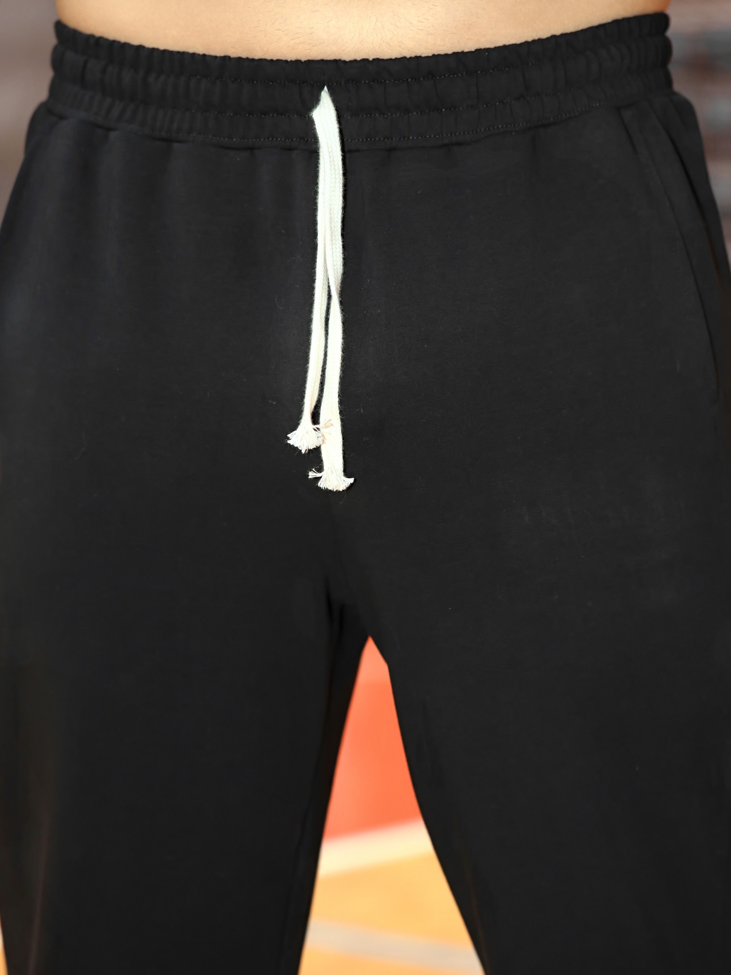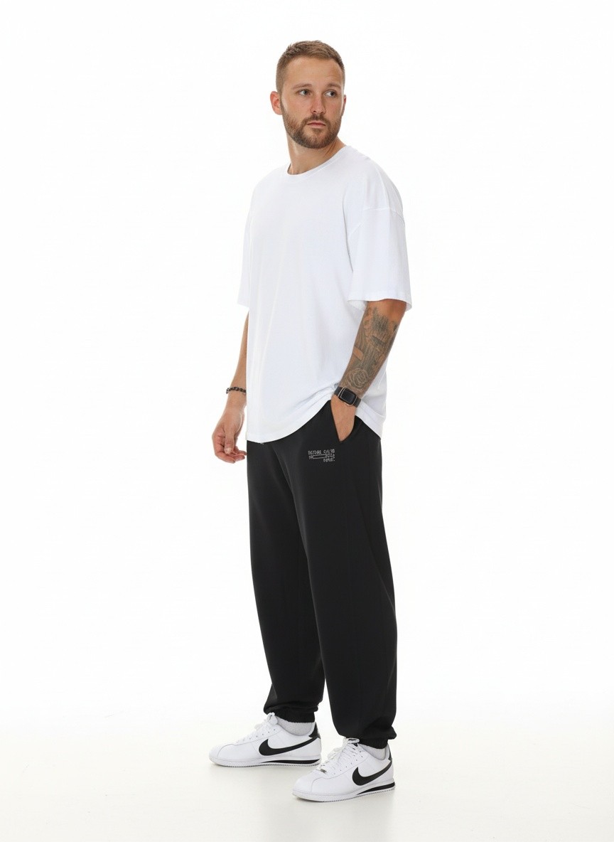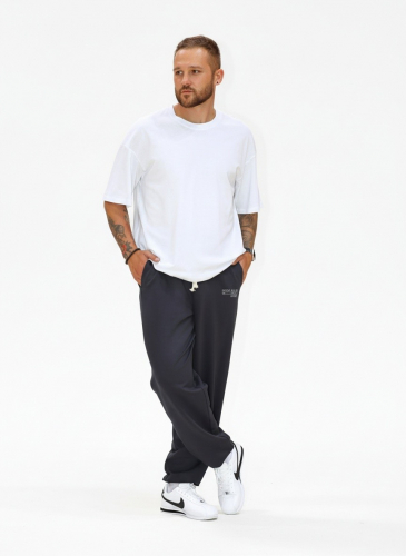 "Брюки мужские из трикотажного полотна ""футер-двунитка"" на притачном поясе с эластичной тесьмой внутри, декоративными вставками в боковых швах и карманами, обработанными в соединительных швах передних половин с декоративными вставками. Нижние срезы брюк обработаны с эластичной тесьмой. По швам втачивания вставок и входам в карманы настрочены отделочные строчки. Через петлю пояса продет шнурок, позволяющий регулировать степень прилегания изделия по талии.