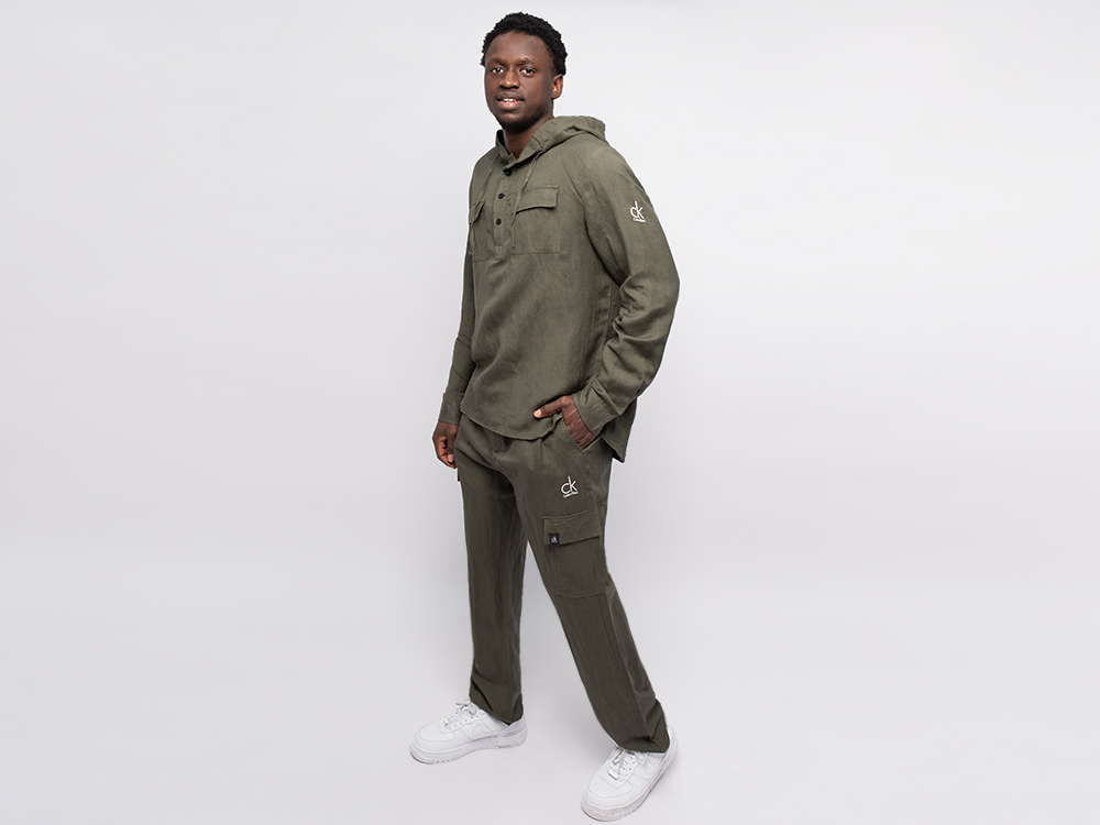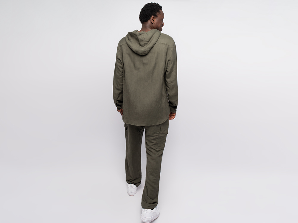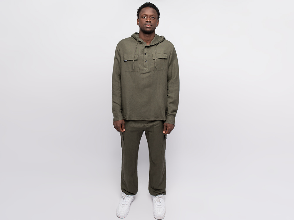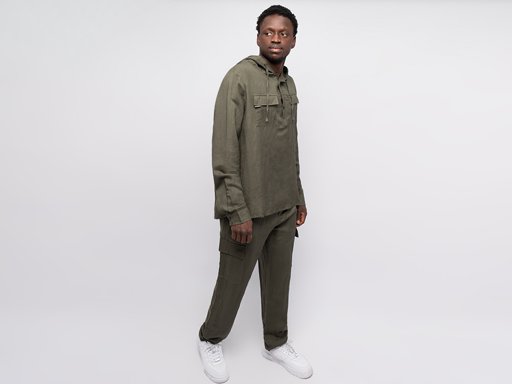 капюшоном, двумя карманами на груди с клапаном на липучке. Брюки прямого кроя, прорезными