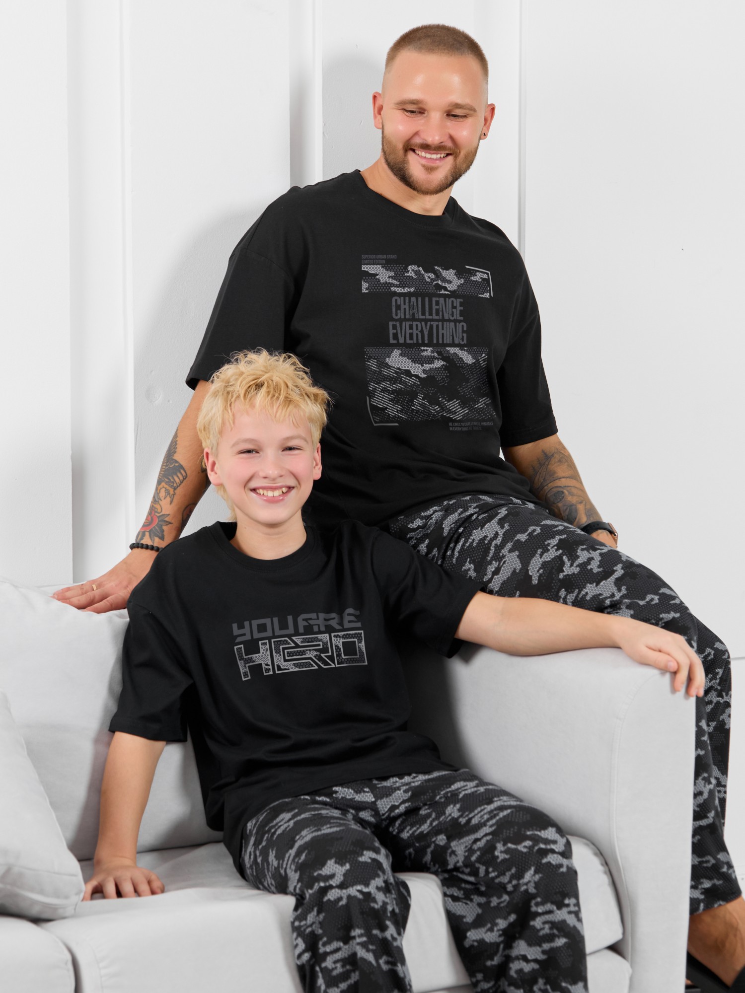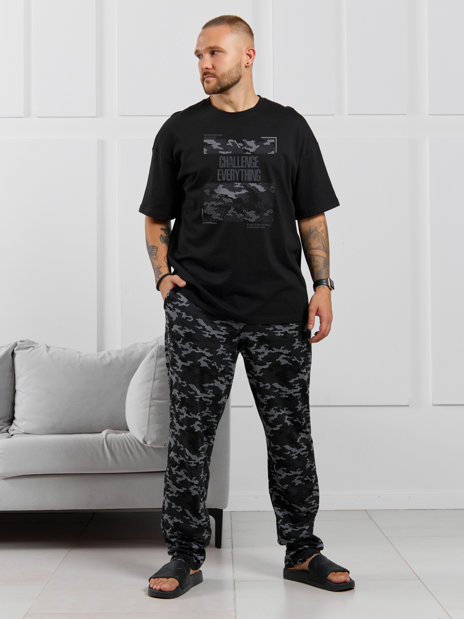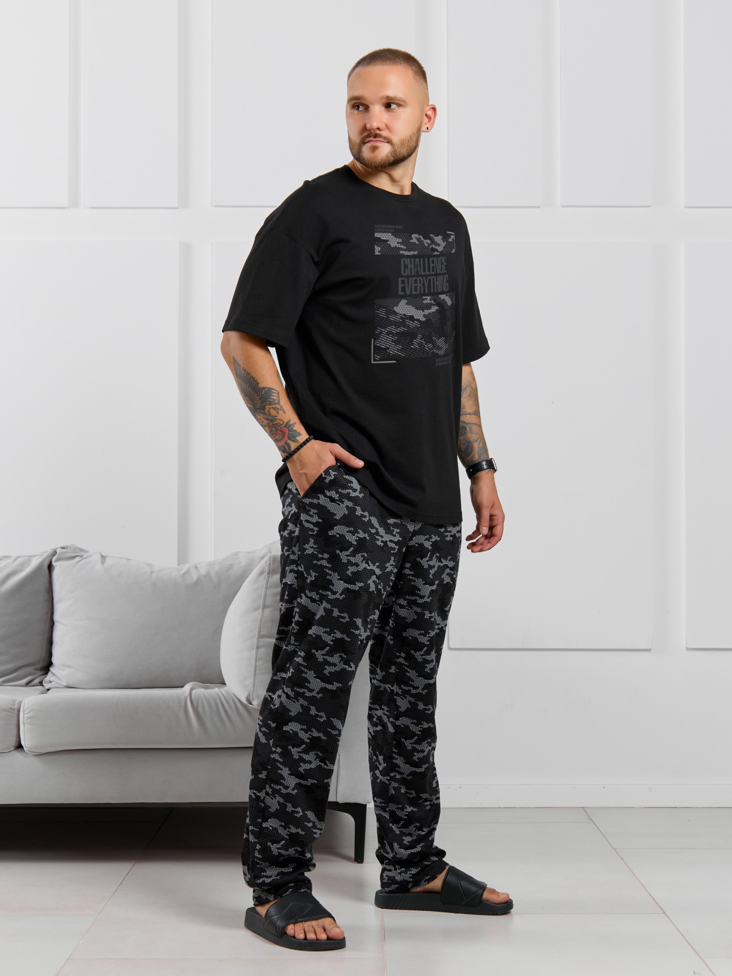 Костюм мужской, состоящий из футболки и брюк. Футболка однотонная с принтом на груди; модель свободная, со спущенной линией плеч, овальным вырезом горловины. Брюки из полотна с набивным рисунком эксклюзивного дизайна, прямые, с боковыми карманами с обтачными входами, на притачном поясе с отстроченной эластичной тесьмой.