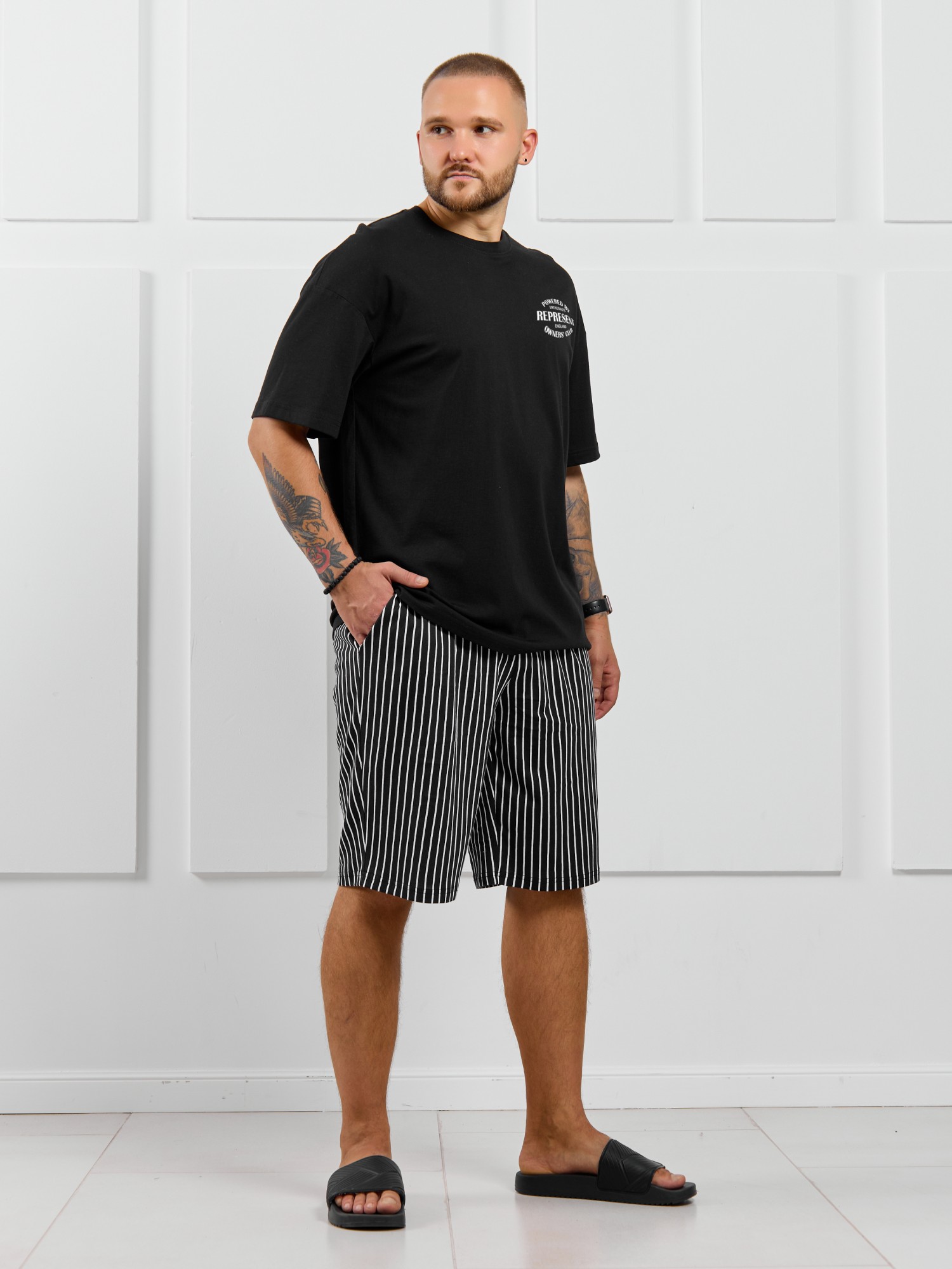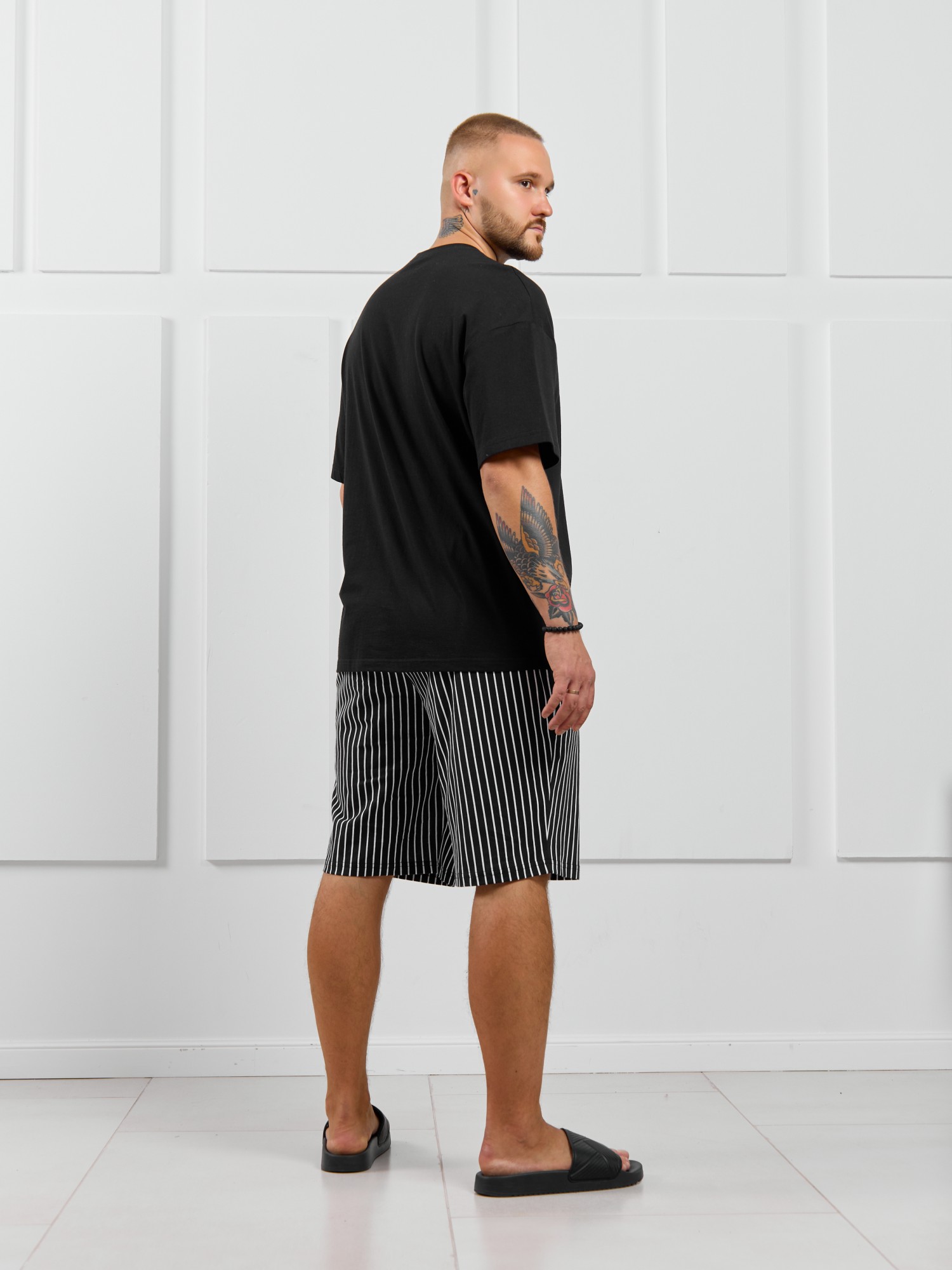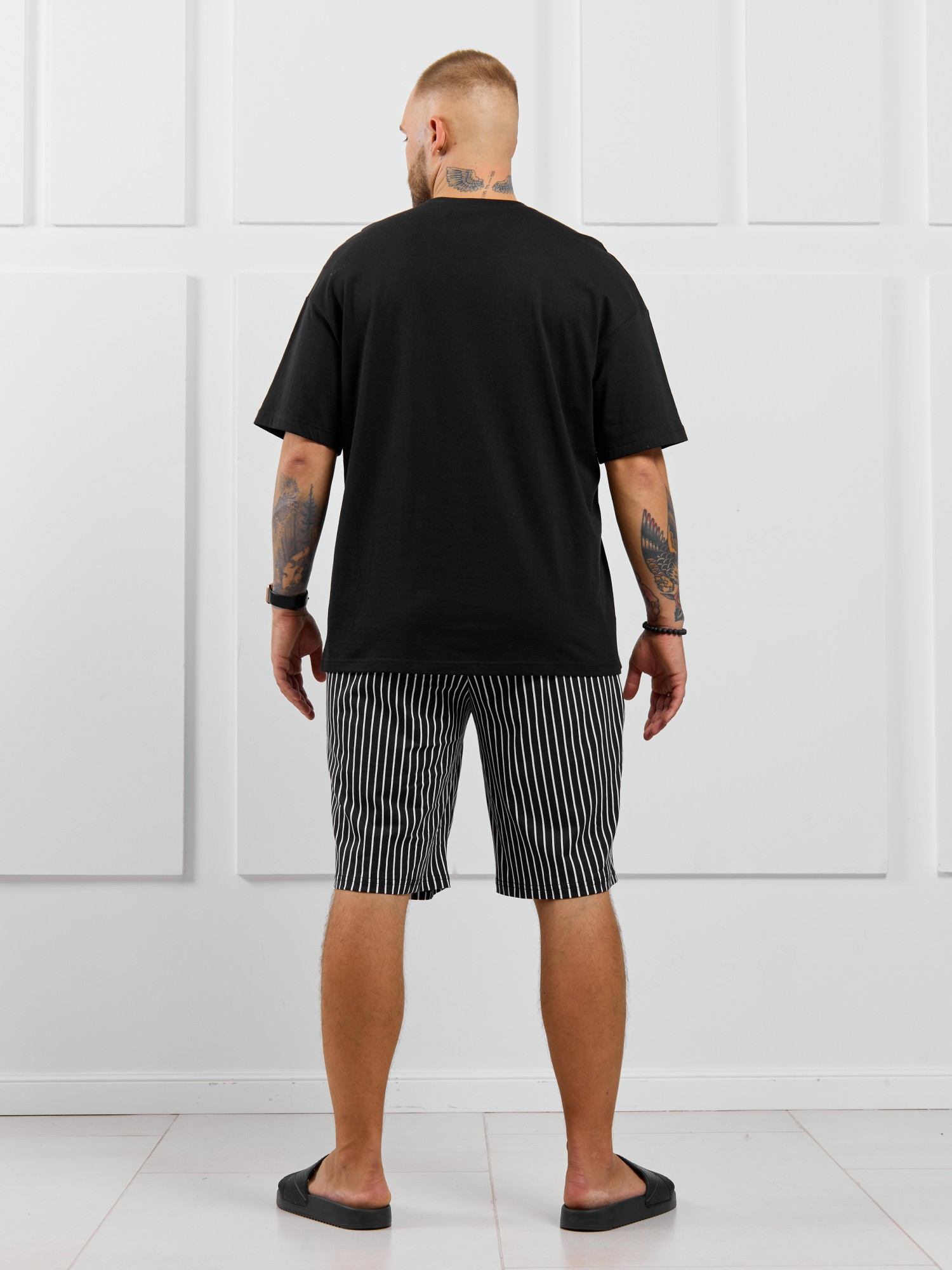 Костюм мужской, состоящий из футболки и шорт. Футболка однотонная с принтом на груди; модель свободная, со спущенной линией плеч. Шорты из полотна с набивным рисунком в узкую черно-белую полоску, с боковыми карманами с обтачными входами, на притачном поясе с отстроченной эластичной тесьмой.