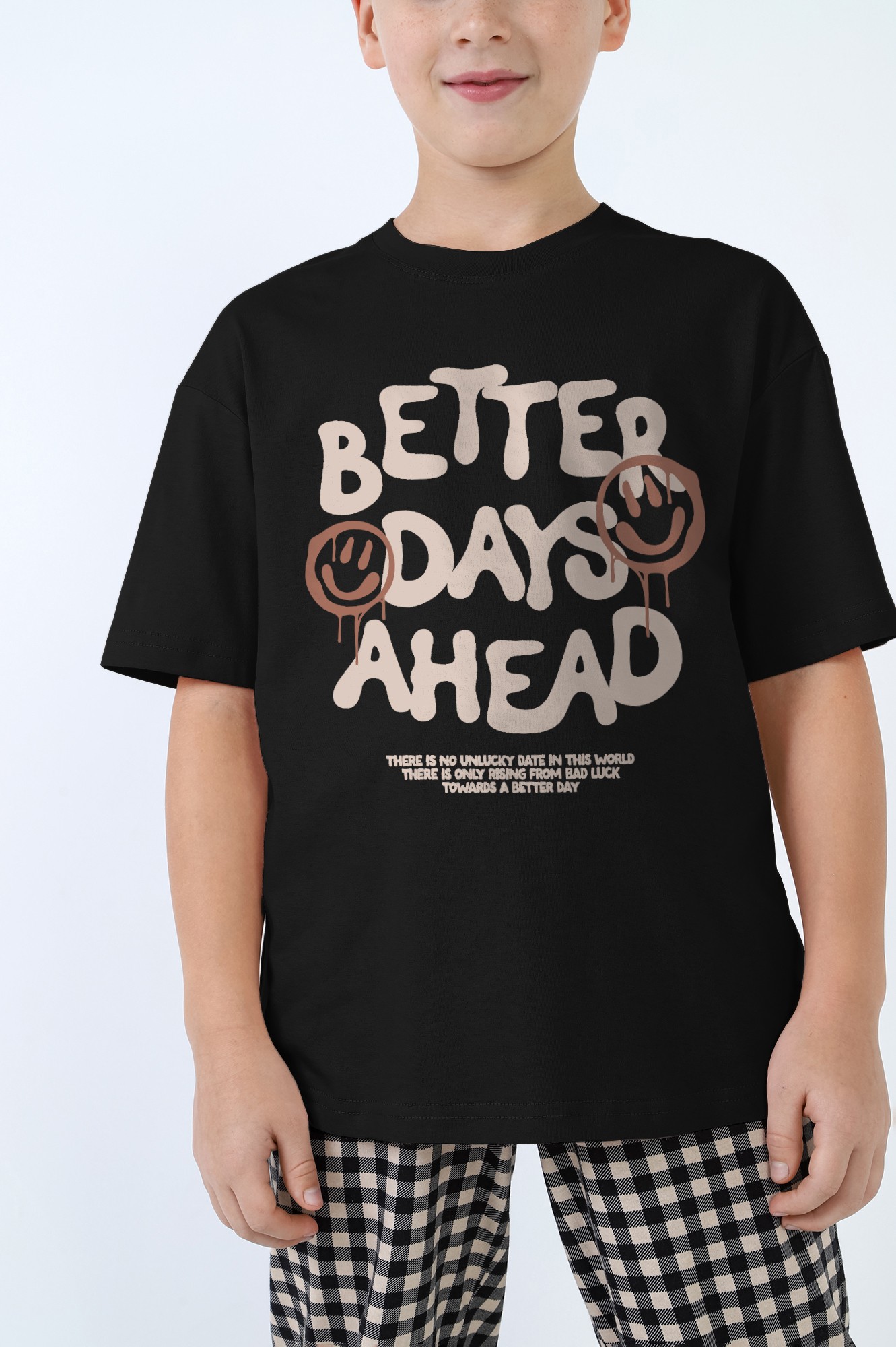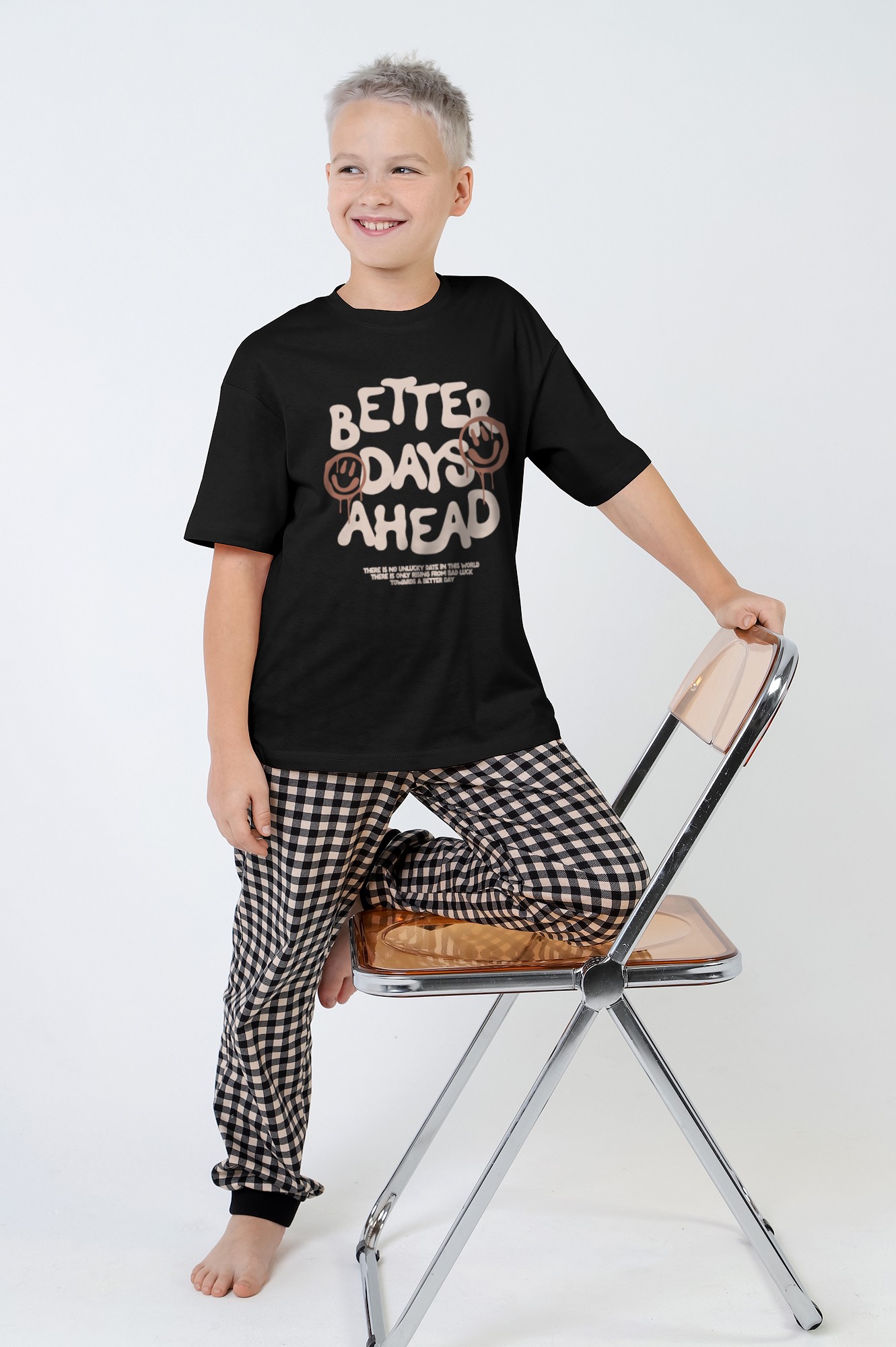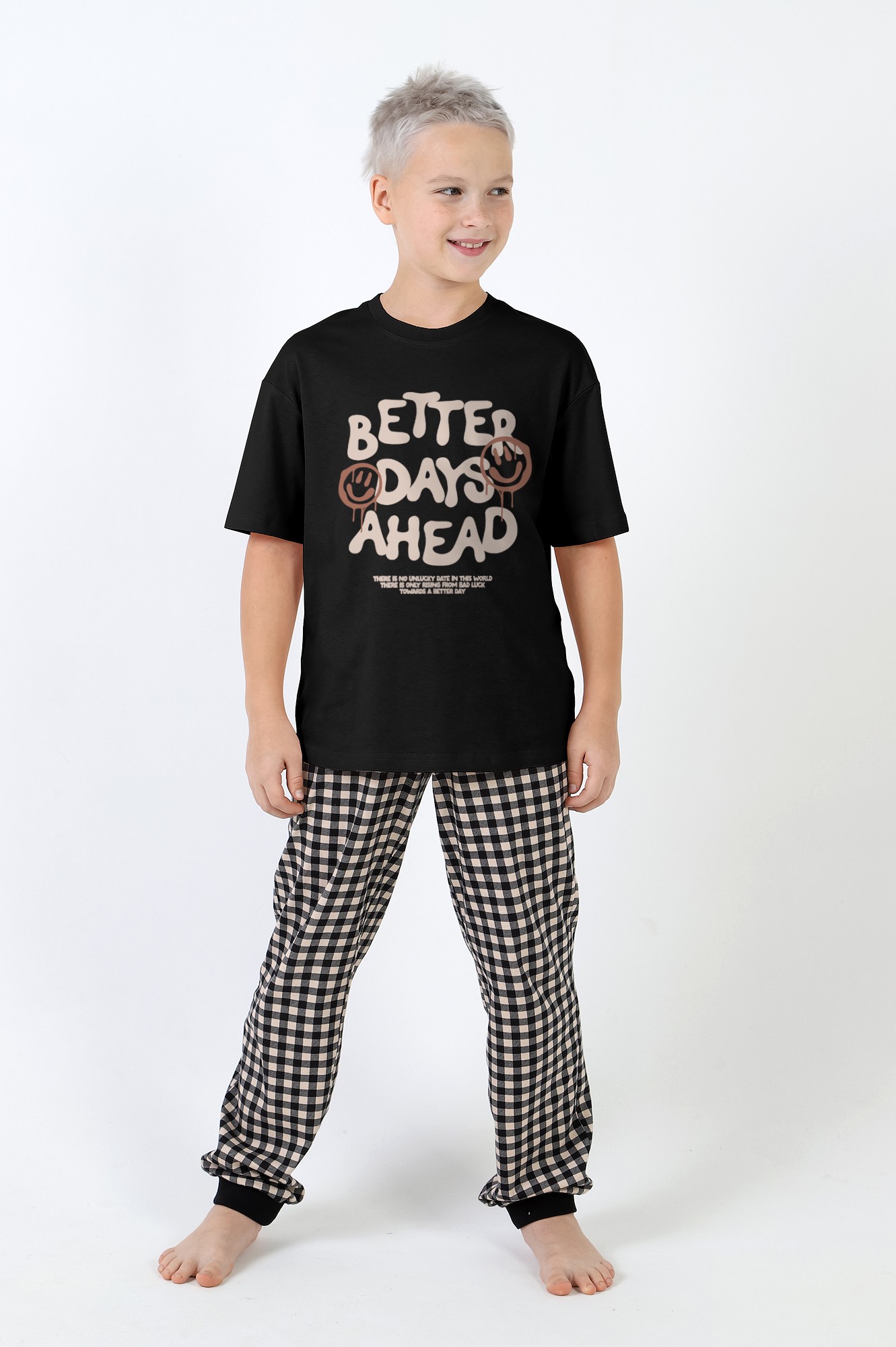 Пижама для мальчика, состоящая из футболки и брюк. Футболка - из гладкокрашеного трикотажного полотна "кулирка", классического покроя: с короткими втачными рукавами, горловиной овальной формы, обработанной втачной планкой и принтом в центре переда, выполненным в технике шелкографии. Брюки - из трикотажного полотна "кулирка" в клетку, длинные, с эластичной тесьмой на поясе и притачными манжетами из полотна "кашкорсе" черного цвета.