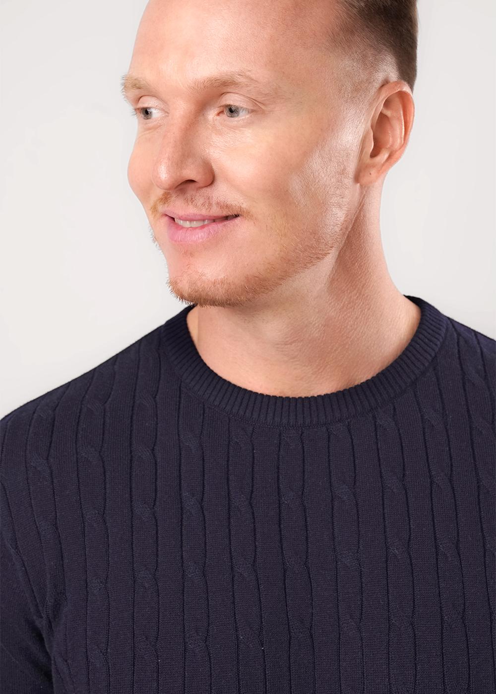 Джемпер мужской из смесовой хлопковой пряжи с длинным рукавом и груглой горловиной. Изделие дополнено вязкой с классическим узором "косы". Прекрасно сохраняет тепло, отличное решение на холодное время года. Комбинируется с джинсами или брюками.