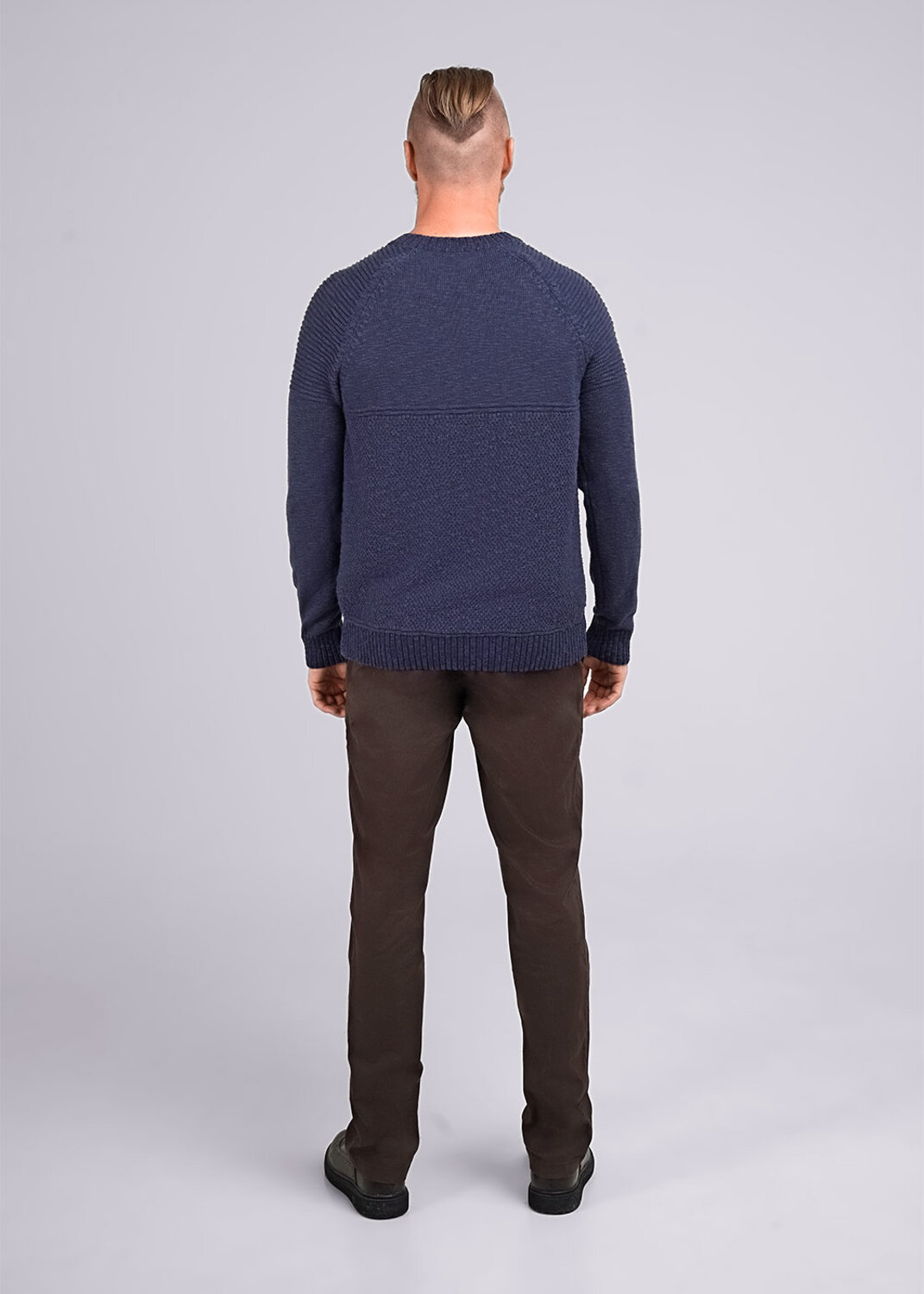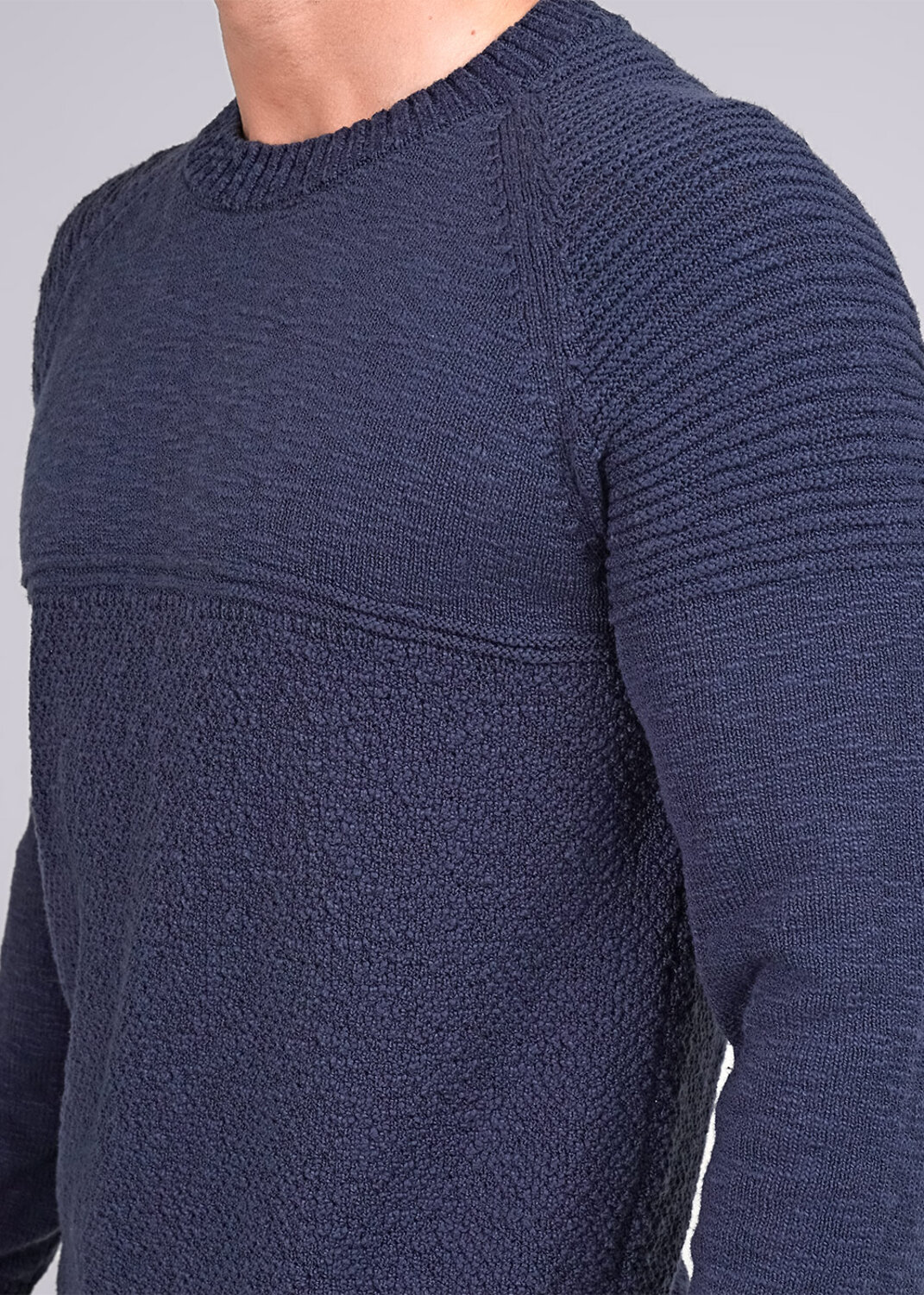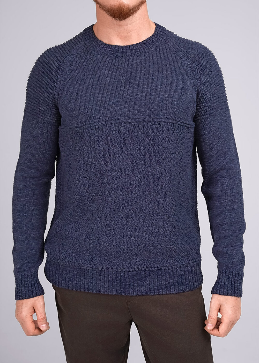 Мужской джемпер с длинным рукавом-реглан и круглой горловиной. Модель связана из объемной фламированной пряжи фактурным переплетением. Изделие можно сочетать с джинсами и брюками.