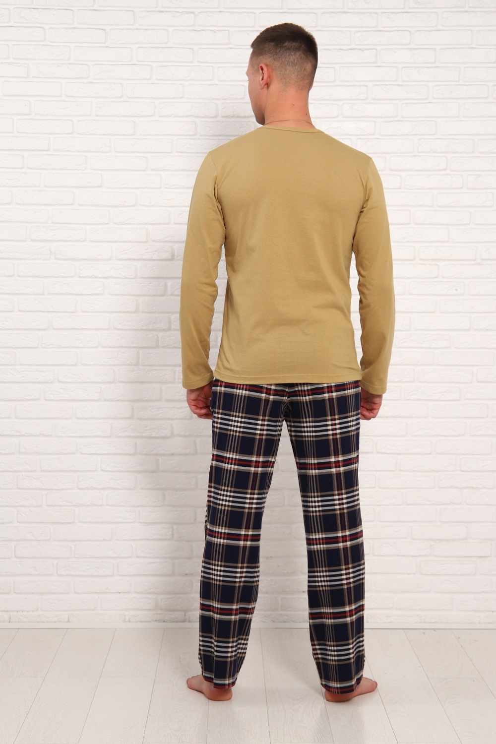 Мужская пижама классического кроя и стиля. Обнотонная футболка с принтом, с длинными рукавами и брюки в клетку, с боковыми карманами и эластичным поясом. Размеры 48-56. Цвет: коричневый; Материал: кулирка;кулирка; Состав: 100% хлопок.