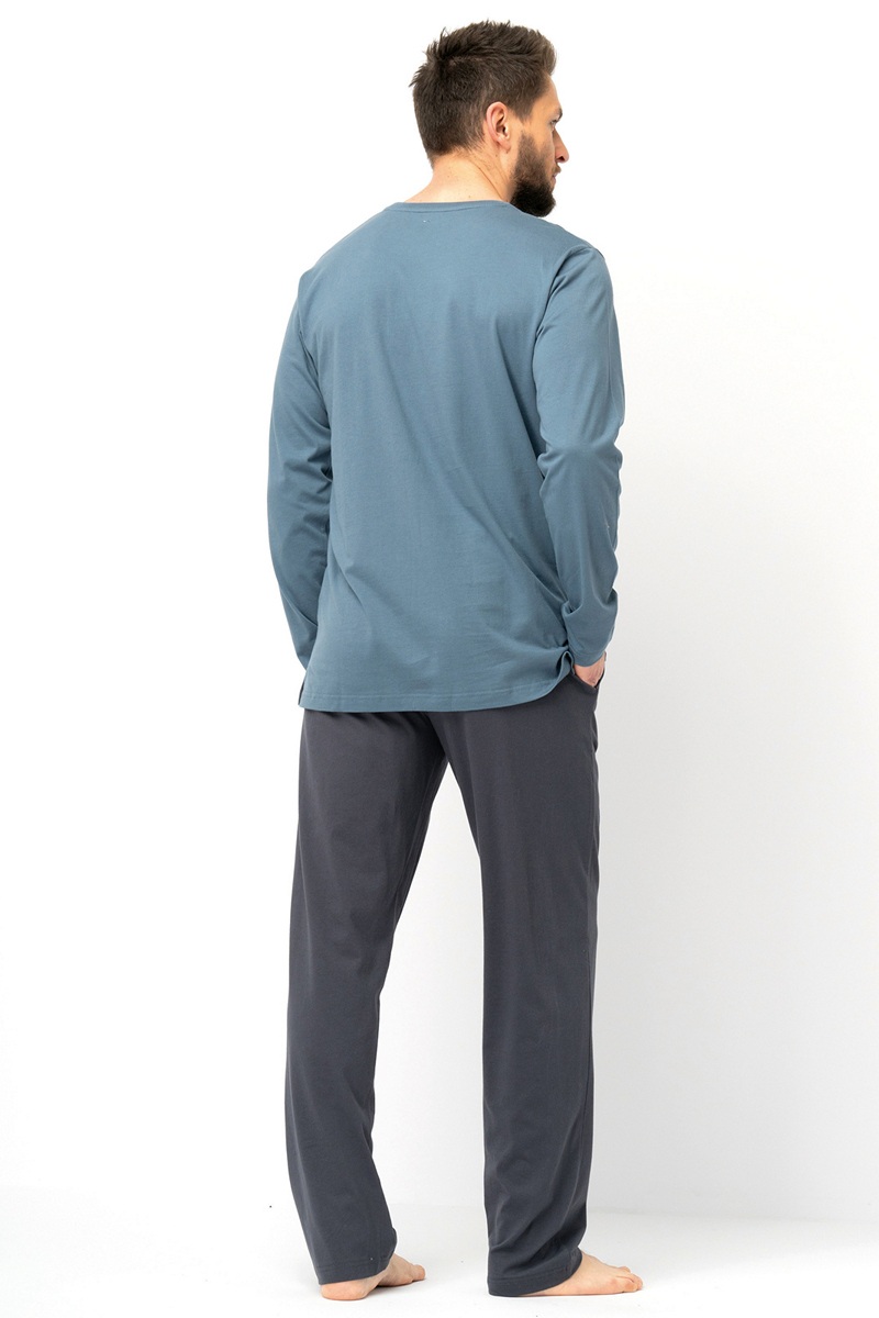 Классическая мужская пижама из мягкого и прочного трикотажа. 100% натуральное волокно обеспечивает тепло и очень высокий комфорт при ношении осенью и зимой. Приглушенный лонгслив с круглым вырезом украшен интересным рисунком лесного пейзажа. Гладкие брюки со слегка зауженным кроем с удобной мягкой резинкой на талии и глубокими карманами по бокам. Мягкий и приятный на ощупь хлопок — удобное предложение на все времена года. Очень удобный комплект, который также отлично подойдет в качестве домашней одежды.