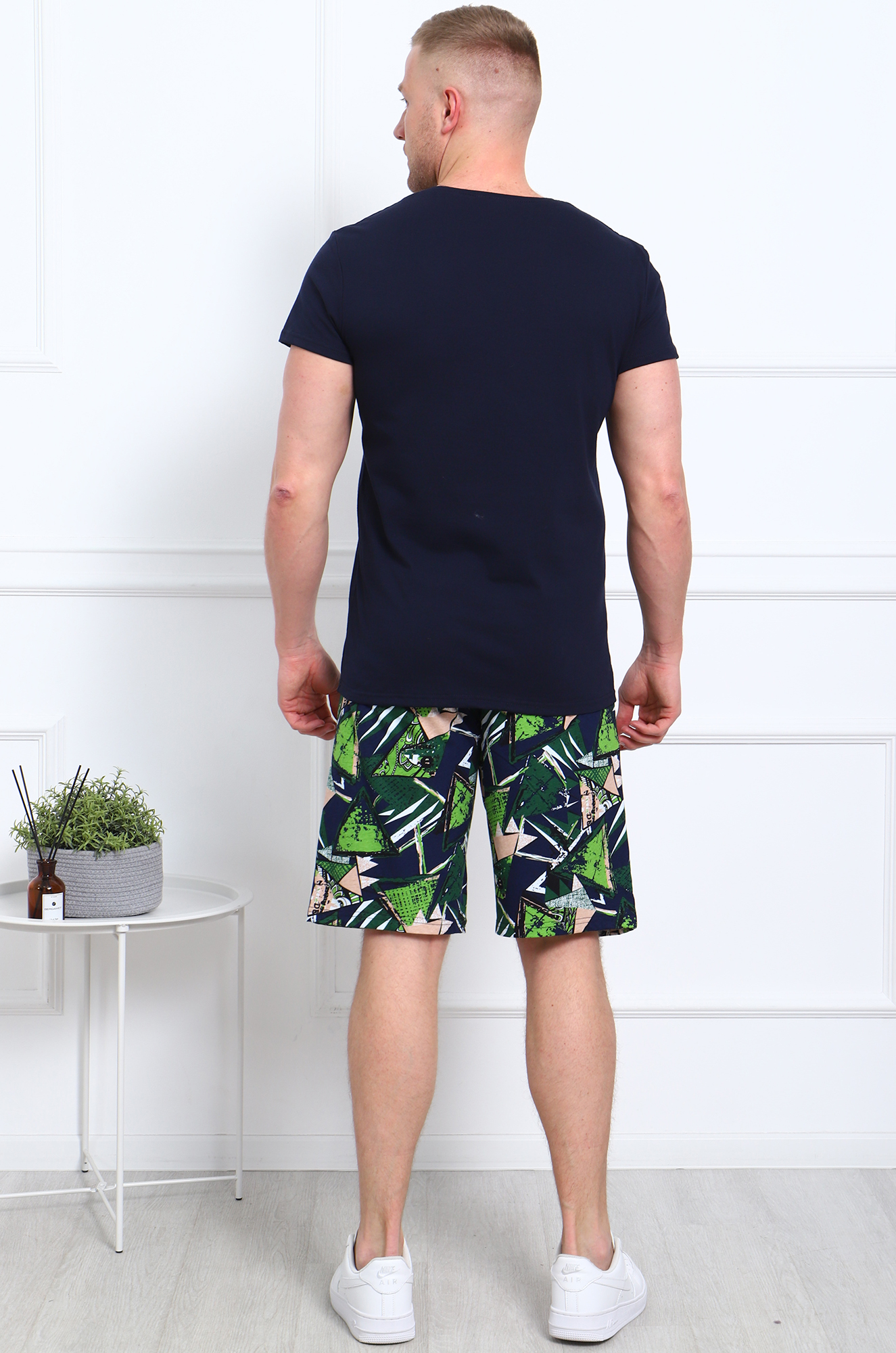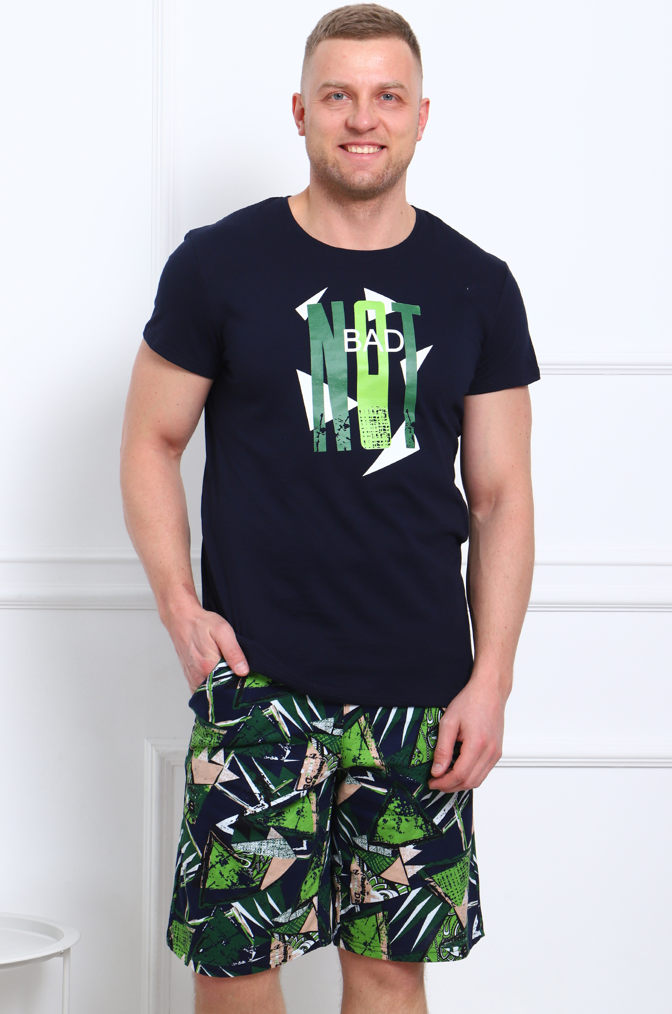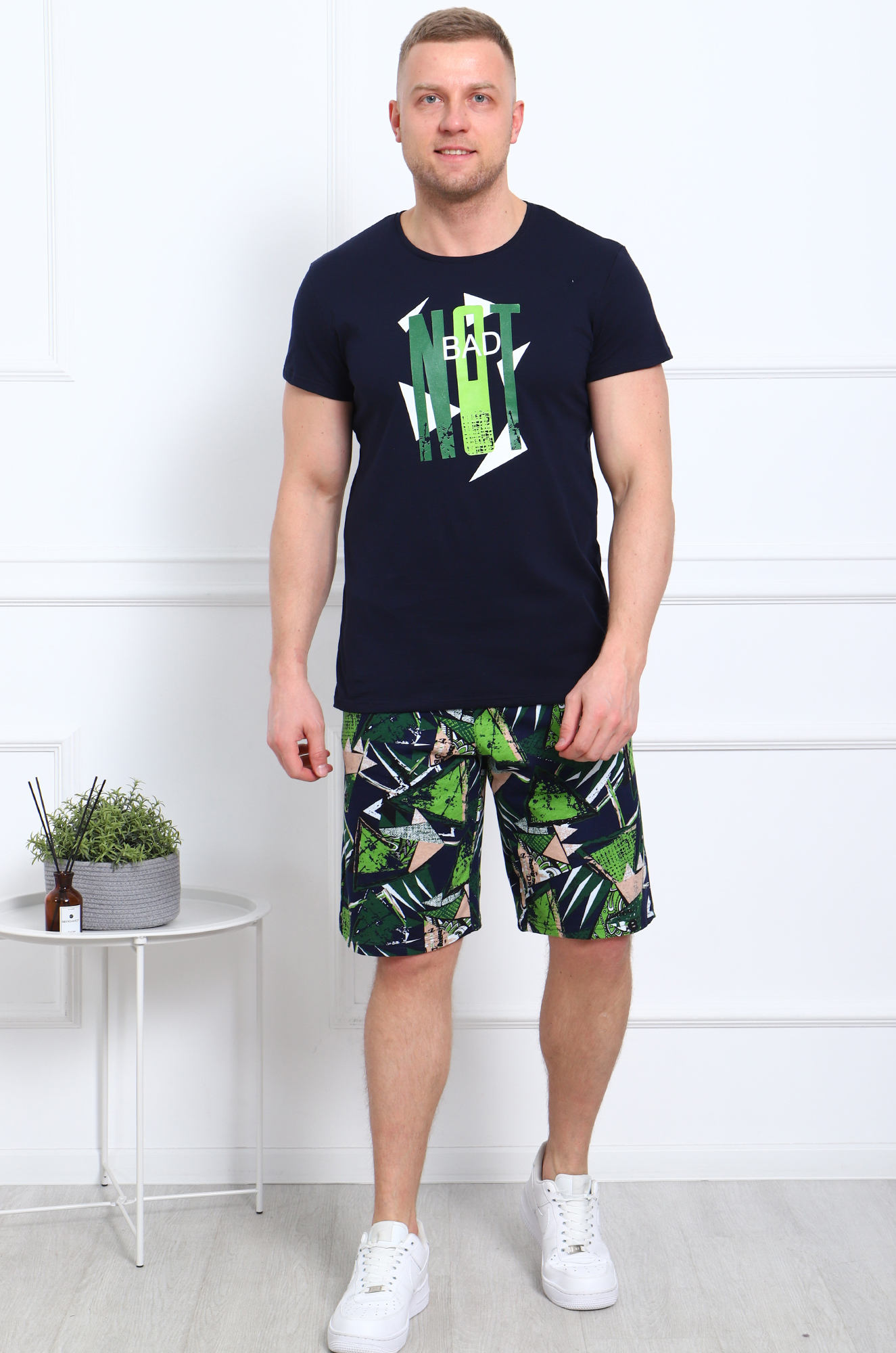 Удобный хлопковый костюм для мужчин, которые хотят выглядеть стильно даже дома! Шорты яркой расцветки, с удобными боковыми карманами, пояс на широкой резинке. Футболка однотонная, прямого кроя с печатью на груди, с коротким втачным рукавом. Ткань - мягкое и приятное к телу кулирное полотно.