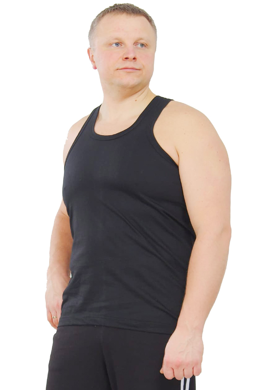 Майка мужская однотонная классический покрой, горловина и пройма обработаны трикотажной окантовкой. Изделие произведено в Узбекистане из трикотажного гладкокрашенного кулирного полотна плотностью 150 г/м2, состав 100%  хлопок.