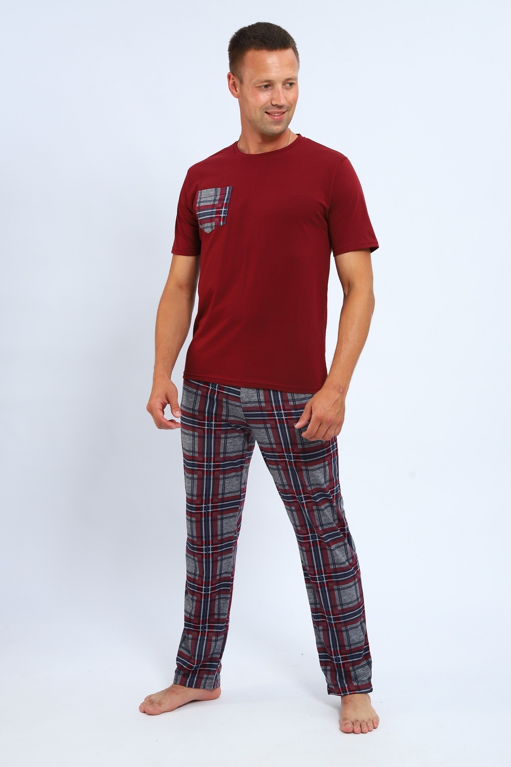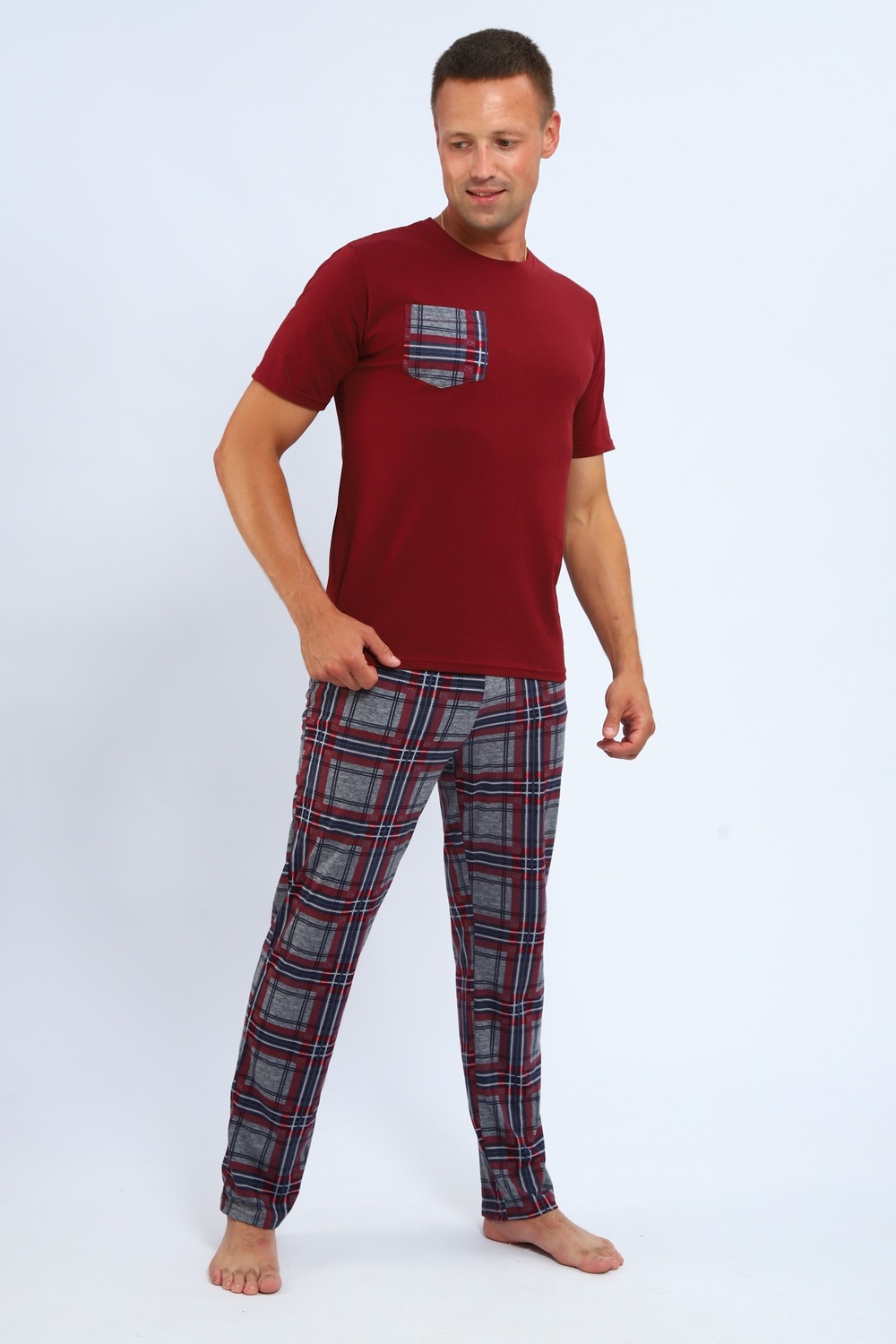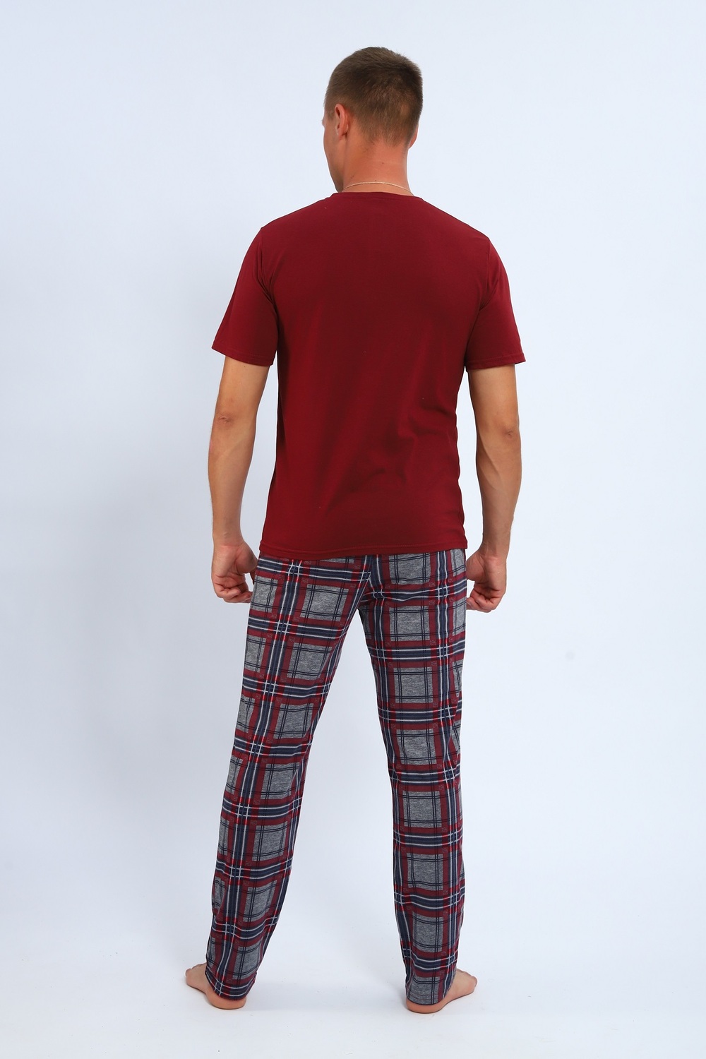 Комплект домашней одежды для мужчины от Руся трикотаж, состоящий из футболки и свободных брюк в клетку. Цвет: бордо,серый; Материал: кулирка;кулирка; Состав: хлопок 100%.