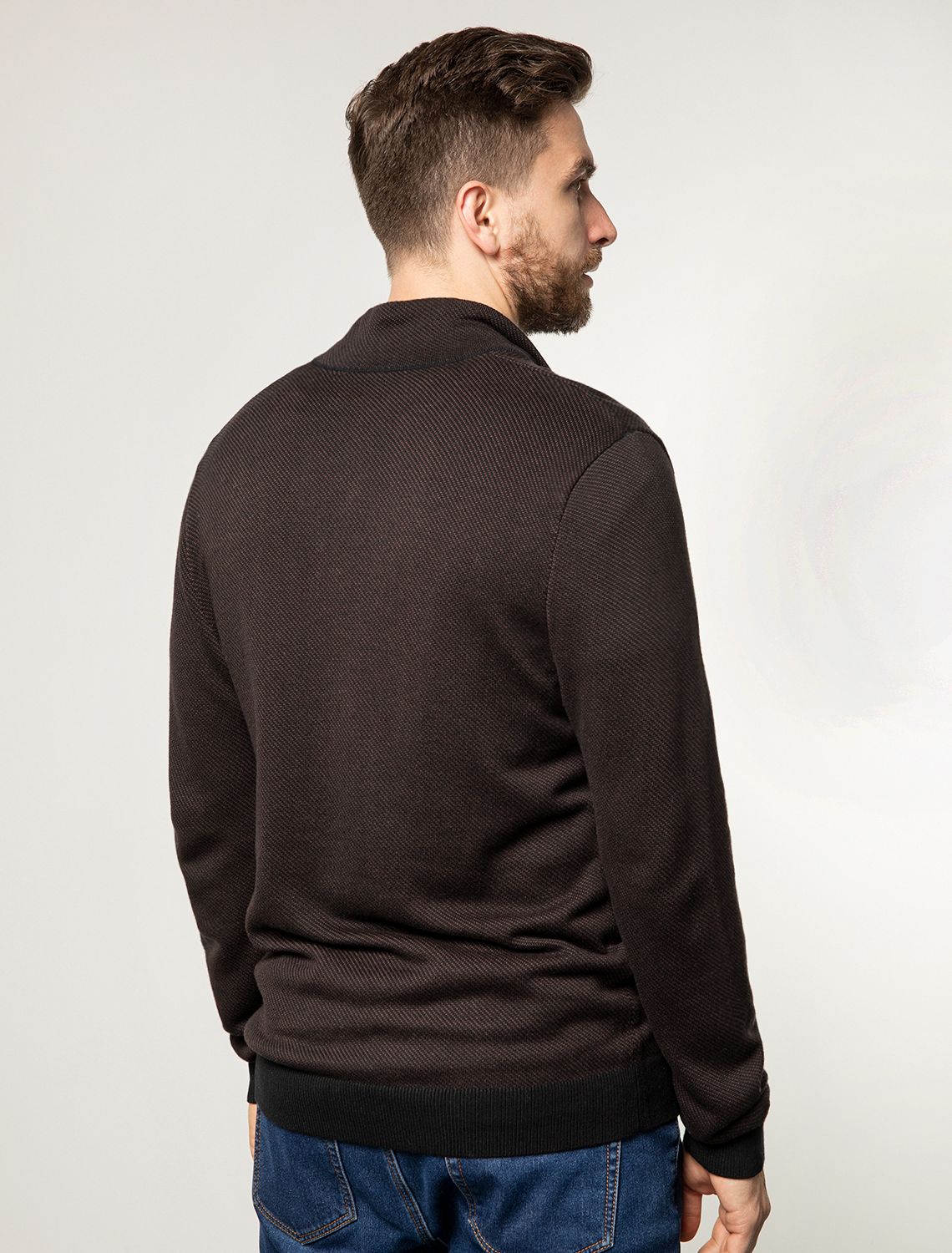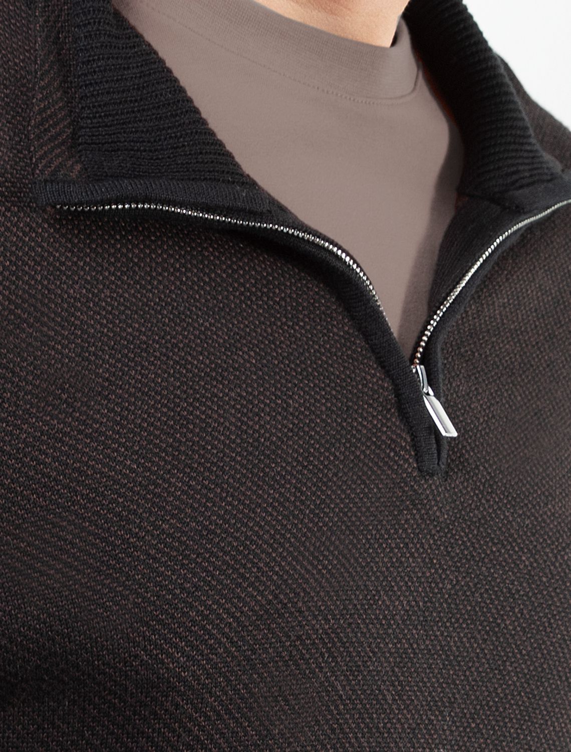 Черно-коричневый джемпер с длинными рукавами выполнен из мягкой хлопковой пряжи с добавлением акрила. Высокий воротник застегивается молнией. За счет переплетения светлых и темных нитей получилась фактурная меланжевая модель, которая, отлично держит тепло и почти не ощущается на теле. Сочетается с футболками, денимом и с чиносами, любой обувью.